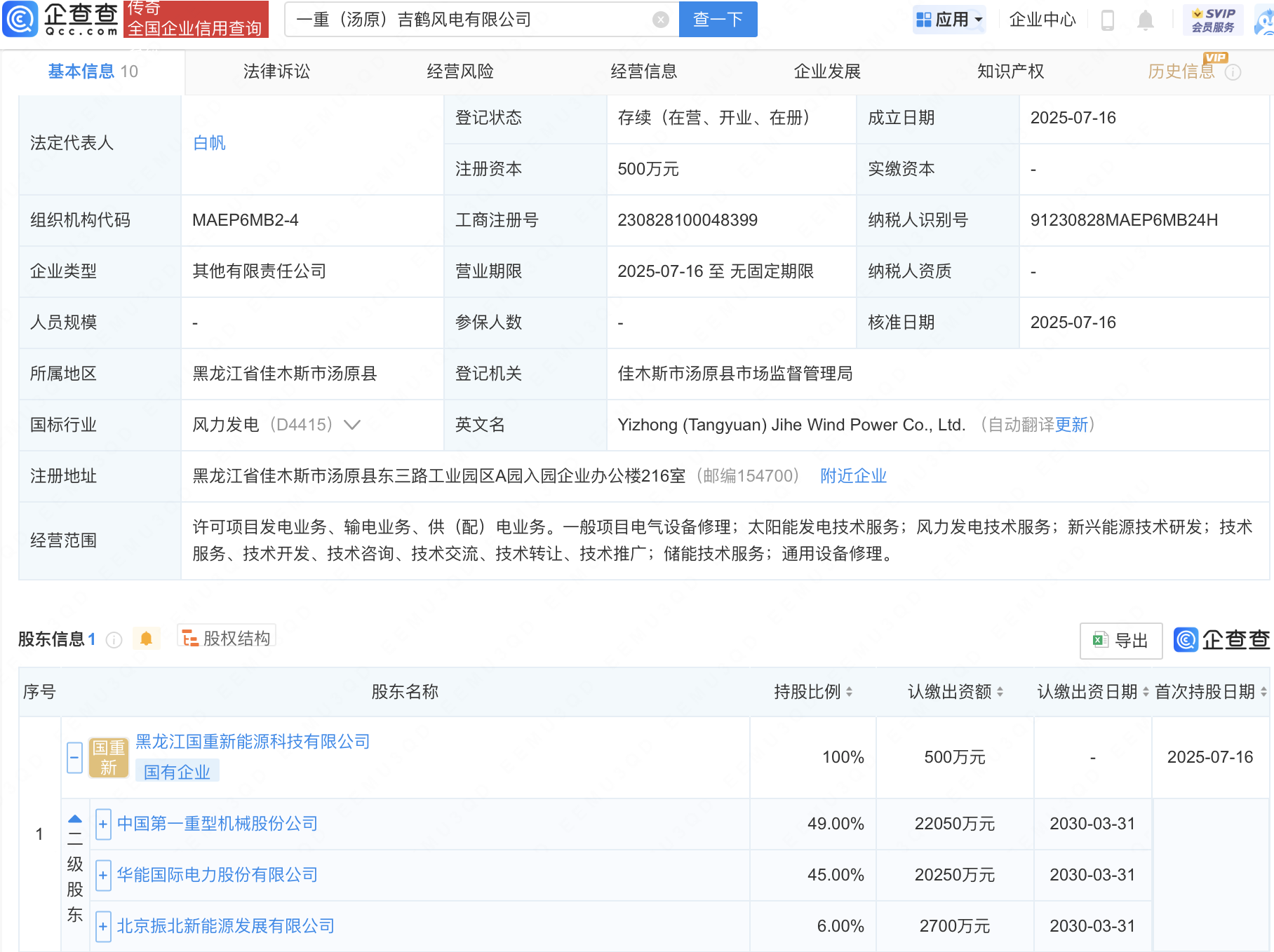 企查查APP显示,近日,一重(汤原)吉鹤风电有限公司成立,法定代表人为白帆,经营范围包含:太阳能发电技术服务;风力发电技术服务;新兴能源技术研发等。企查查股权穿透显示,该公司由黑龙江国重新能源科技有限公司全资持股,后者大股东为中国一重(601106)。