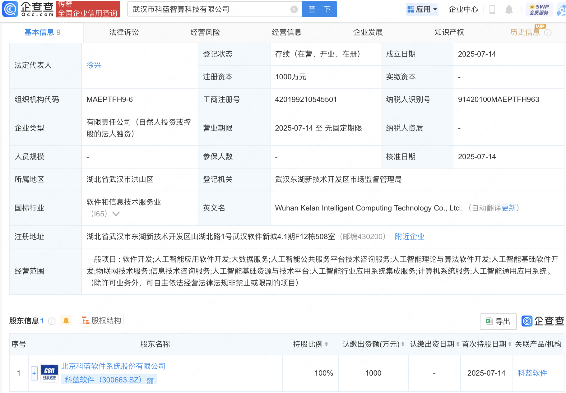 企查查APP显示,近日,武汉市科蓝智算科技有限公司成立,法定代表人为徐兴,经营范围包含:人工智能应用软件开发;大数据服务;人工智能公共服务平台技术咨询服务;人工智能理论与算法软件开发等。企查查股权穿透显示,该公司由科蓝软件(300663)全资持股。