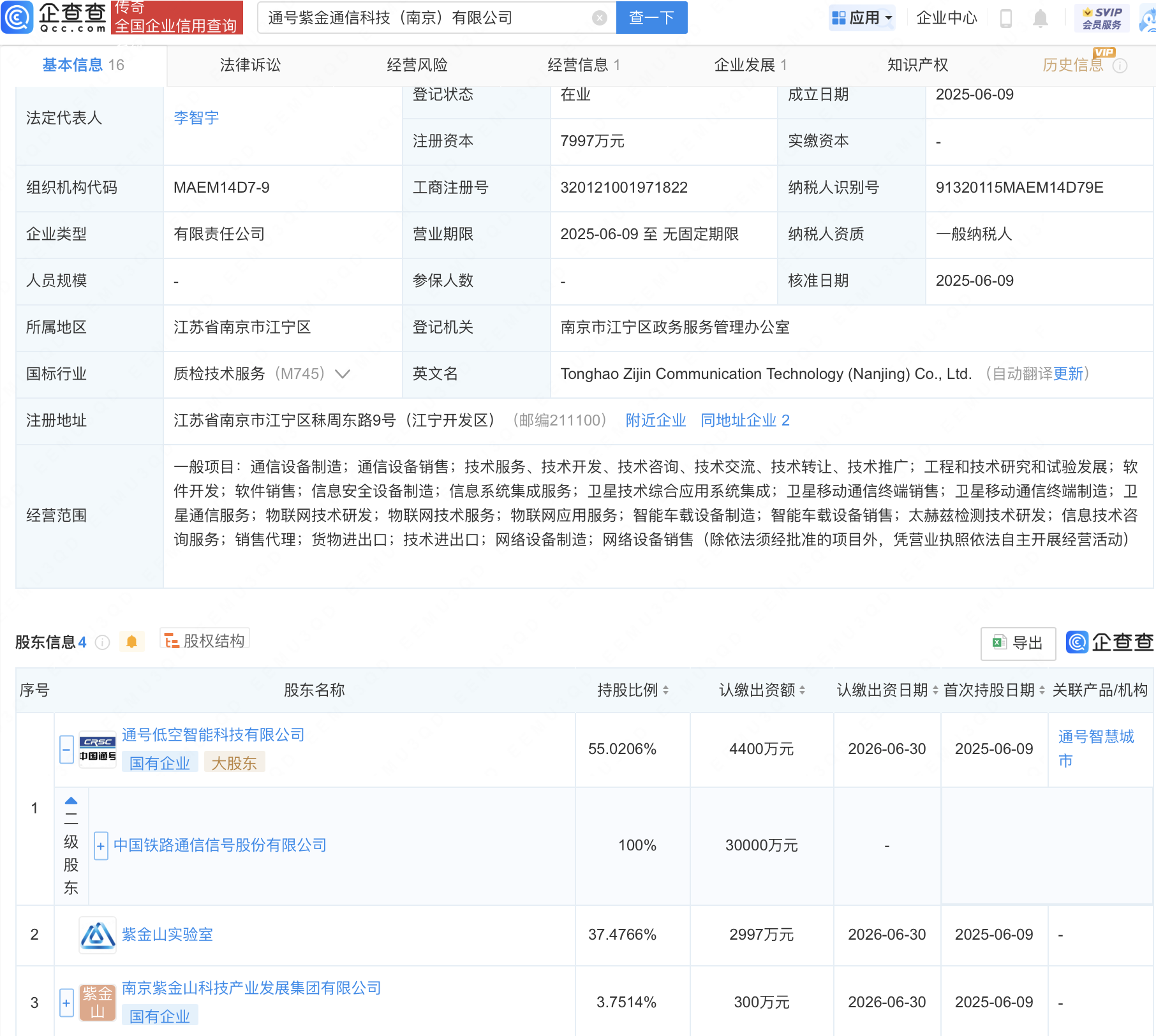 企查查APP显示,近日,通号紫金通信科技(南京)有限公司成立,注册资本7997万元,经营范围包含:卫星技术综合应用系统集成;卫星移动通信终端销售;卫星移动通信终端制造;卫星通信服务等。企查查股权穿透显示,该公司由中国通号(688009)全资子公司通号低空智能科技有限公司等共同持股。
