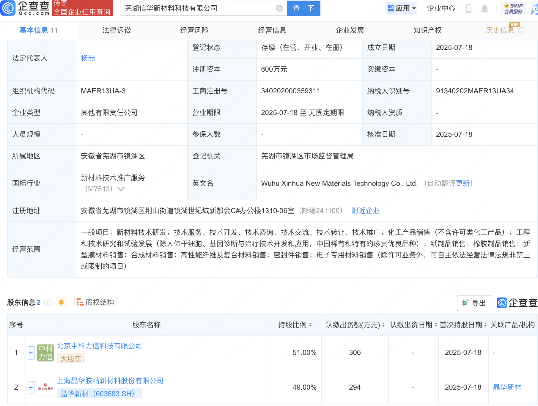企查查APP显示,近日,芜湖信华新材料科技有限公司成立,法定代表人为杨喆,经营范围包含:新型膜材料销售;合成材料销售;高性能纤维及复合材料销售;密封件销售等。企查查股权穿透显示,该公司由晶华新材(603683)等共同持股。