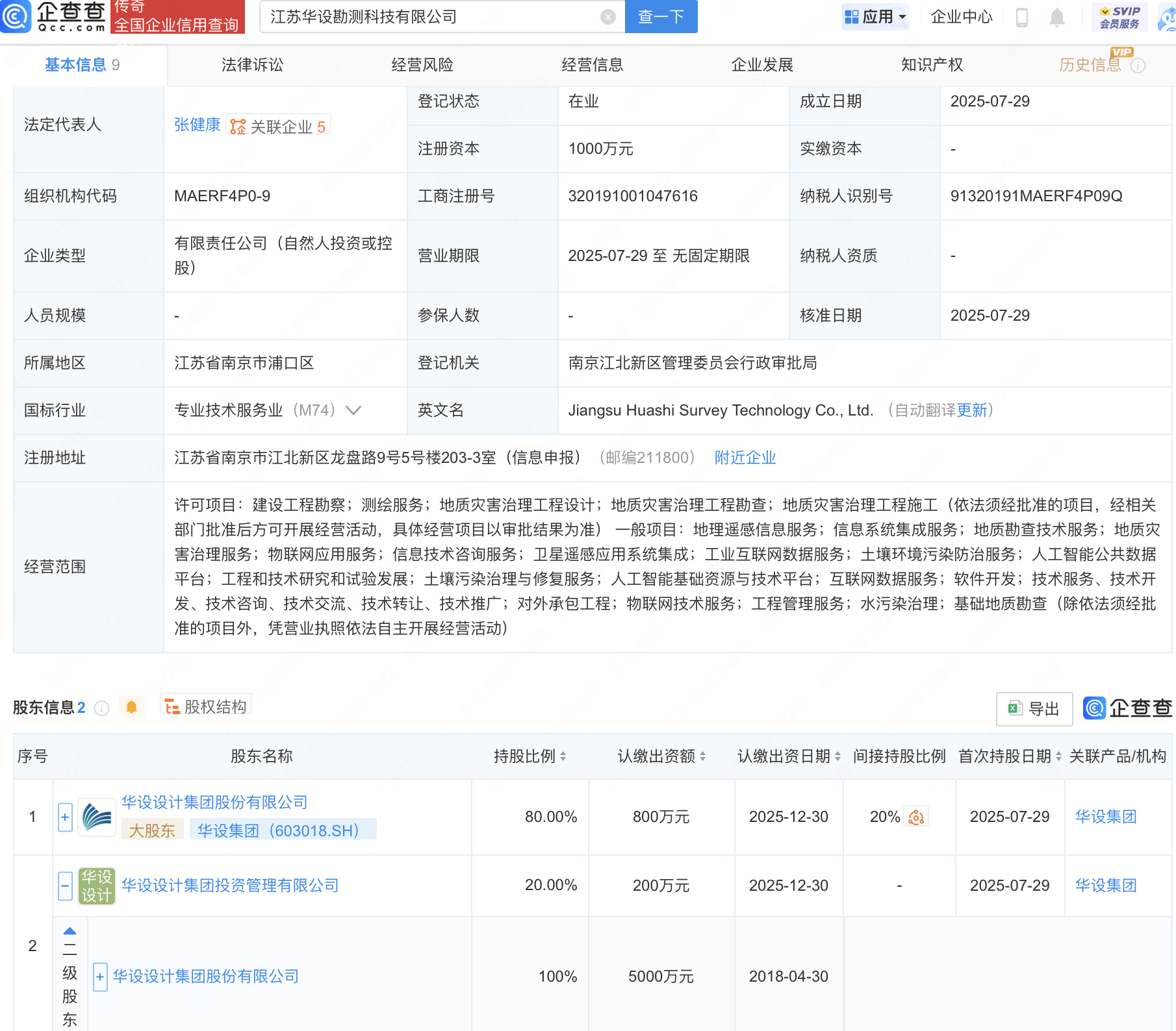企查查APP显示,近日,江苏华设勘测科技有限公司成立,注册资本1000万元,经营范围包含:人工智能公共数据平台;工程和技术研究和试验发展;土壤污染治理与修复服务;人工智能基础资源与技术平台等。企查查股权穿透显示,该公司由华设集团(603018)间接全资持股。