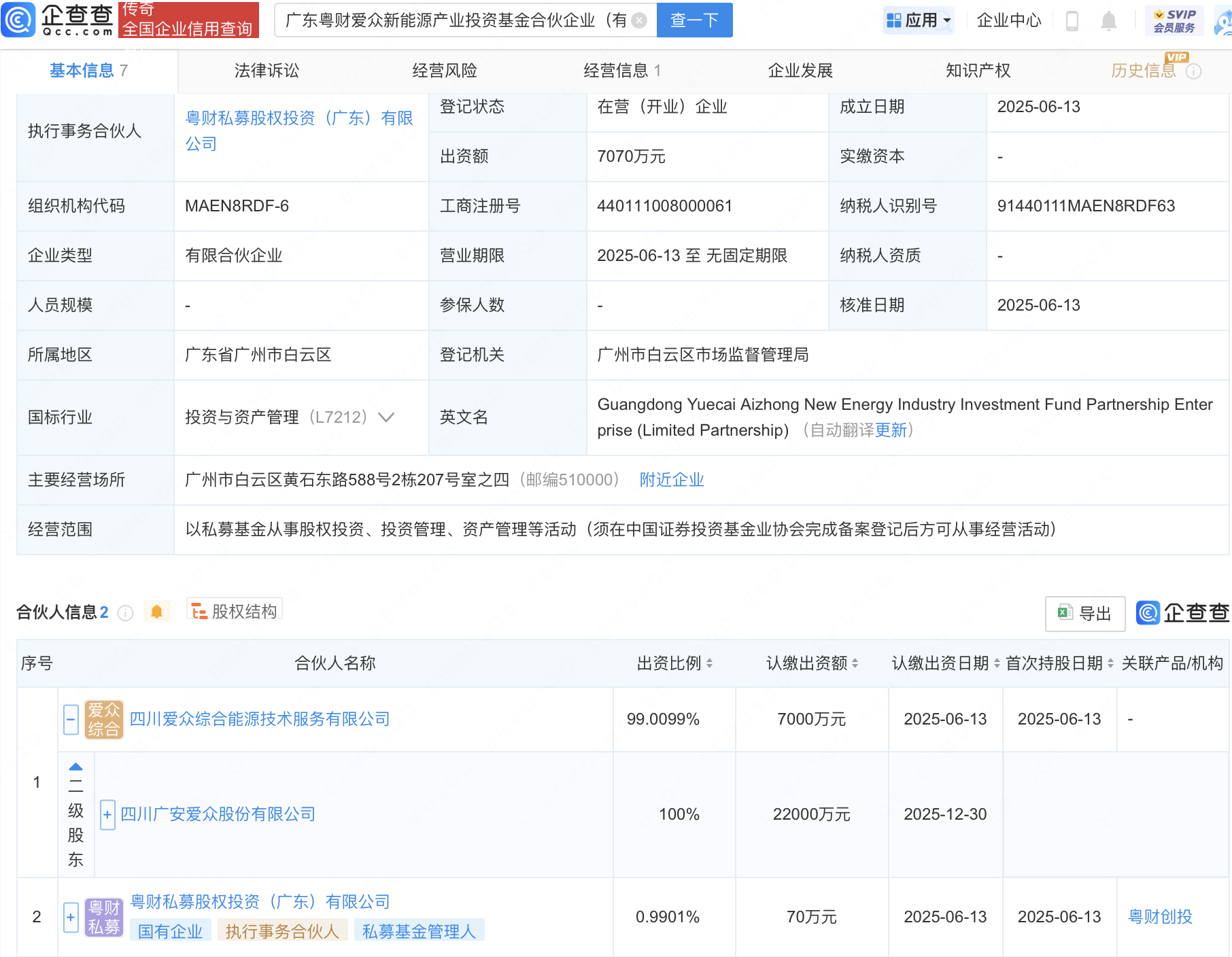 企查查APP显示,近日,广东粤财爱众新能源产业投资基金合伙企业(有限合伙)成立,经营范围包含:以私募基金从事股权投资、投资管理、资产管理等活动。企查查股权穿透显示,该企业由广安爱众(600979)全资子公司四川爱众综合能源技术服务有限公司等共同出资。