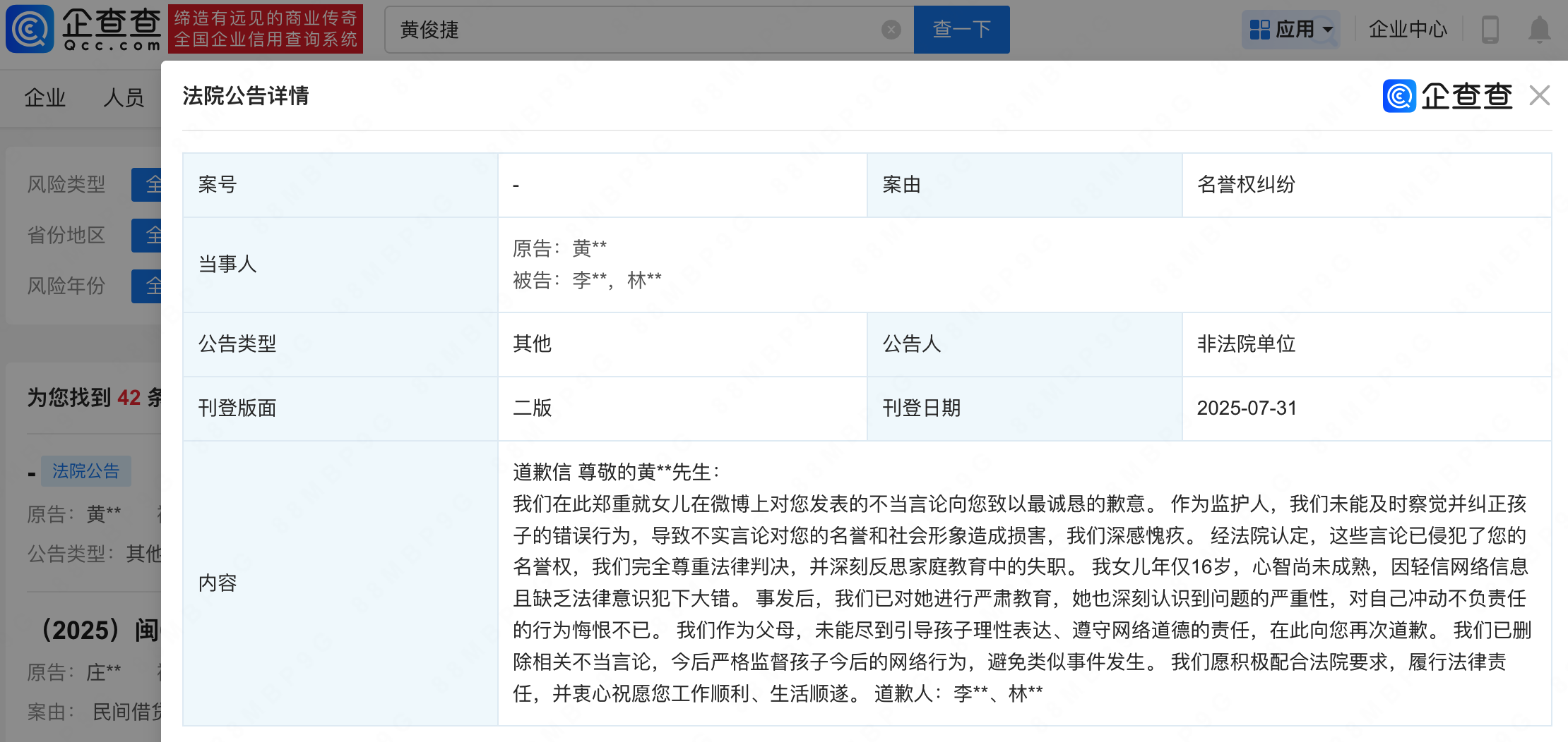 企查查APP显示,7月31日,法院刊登李某、林某向黄俊捷致歉声明。