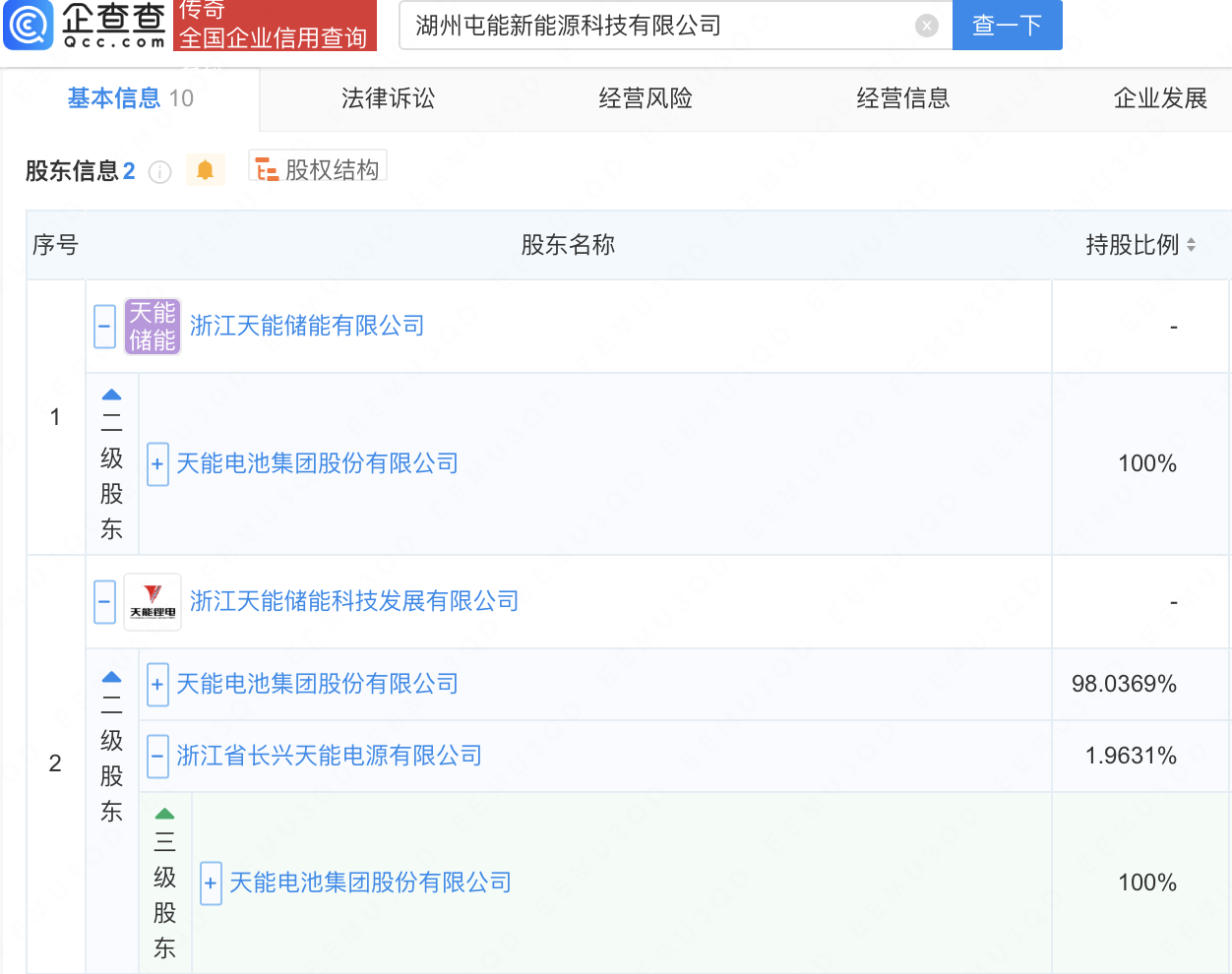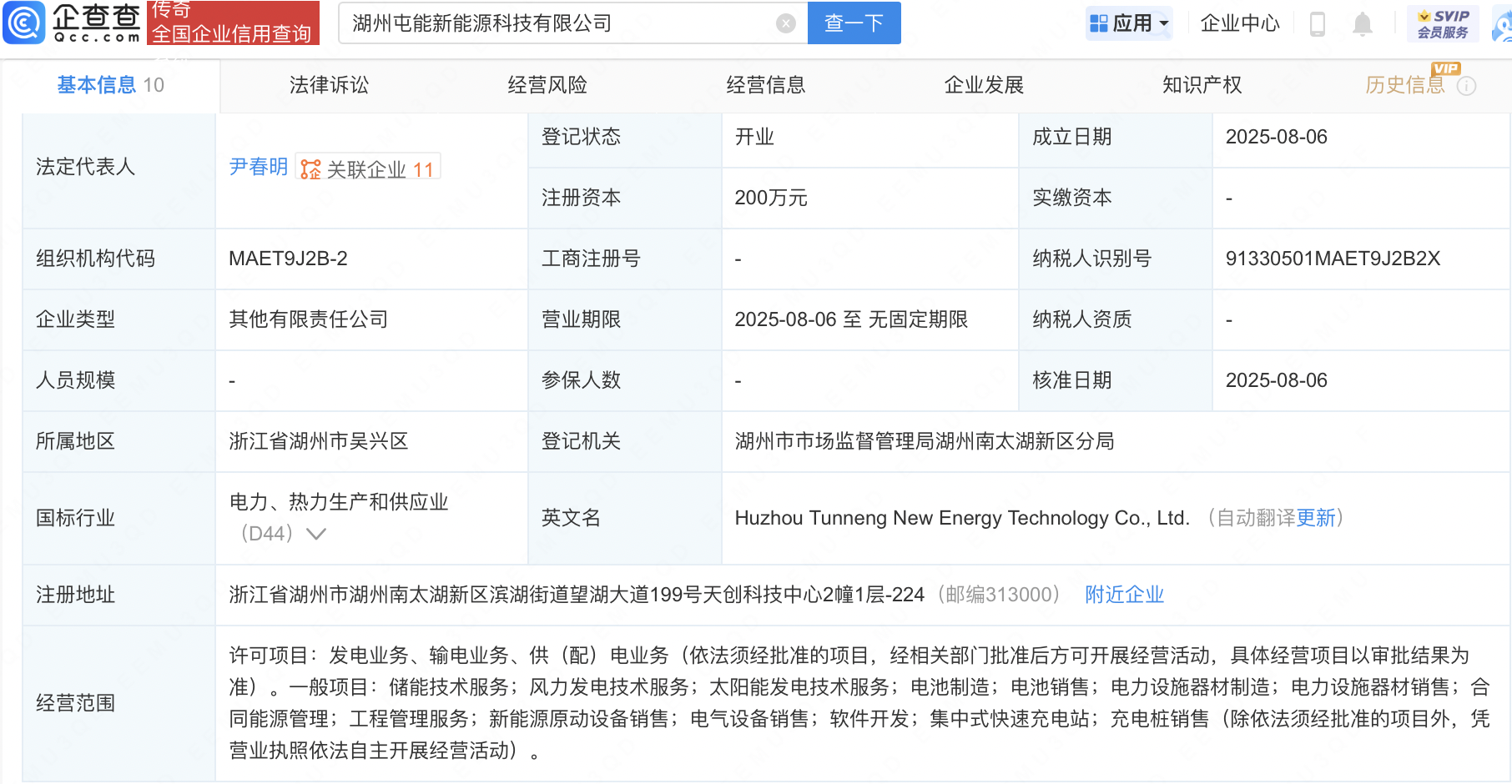 企查查APP显示,近日,湖州屯能新能源科技有限公司成立,法定代表人为尹春明,经营范围包含:风力发电技术服务;太阳能发电技术服务;电池制造;电池销售等。企查查股权穿透显示,该公司由天能股份(688819)间接全资持股。