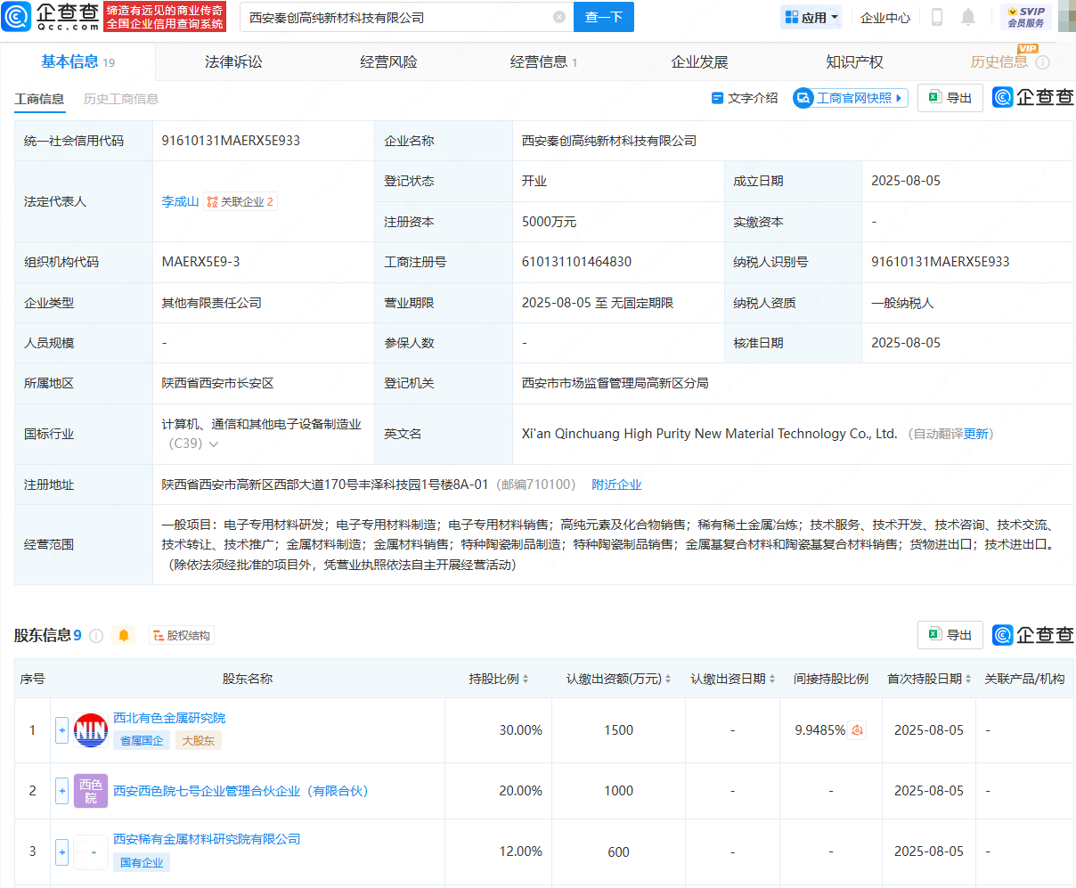 企查查APP显示,近日,西安秦创高纯新材科技有限公司成立,法定代表人为李成山,注册资本为5000万元,经营范围包含:电子专用材料研发;电子专用材料制造;电子专用材料销售;稀有稀土金属冶炼等。企查查股权穿透显示,该公司由西北有色金属研究院、西安西色院七号企业管理合伙企业(有限合伙)等共同持股。