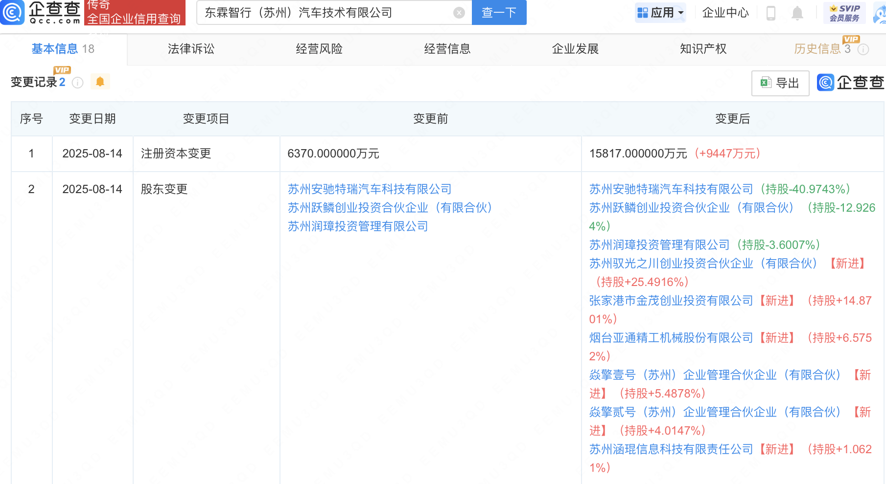 企查查APP显示,近日,东霖智行(苏州)汽车技术有限公司发生工商变更,新增亚通精工(603190)等为股东,同时注册资本增加至约1.58亿。企查查信息显示,该公司成立于2025年7月,经营范围包含:汽车零部件研发;汽车零部件及配件制造;电子元器件制造;液力动力机械及元件制造等。
