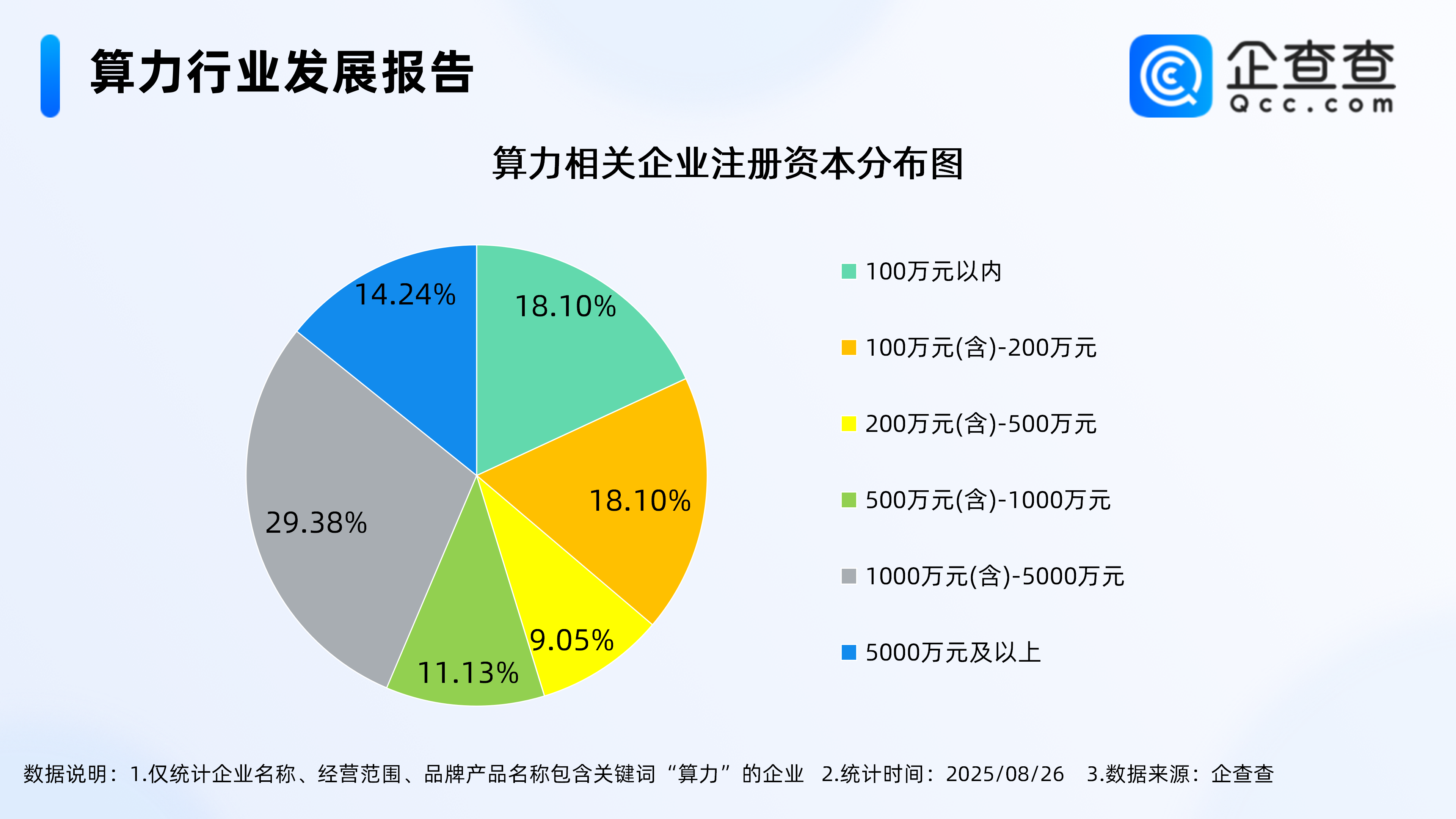 企查查数据显示,从注册资本来看,算力相关企业多为千万层级,其中,注册资本在1000万元(含)-5000万元的相关企业占比29.38%,在5000万元及以上的相关企业占比14.24%。
