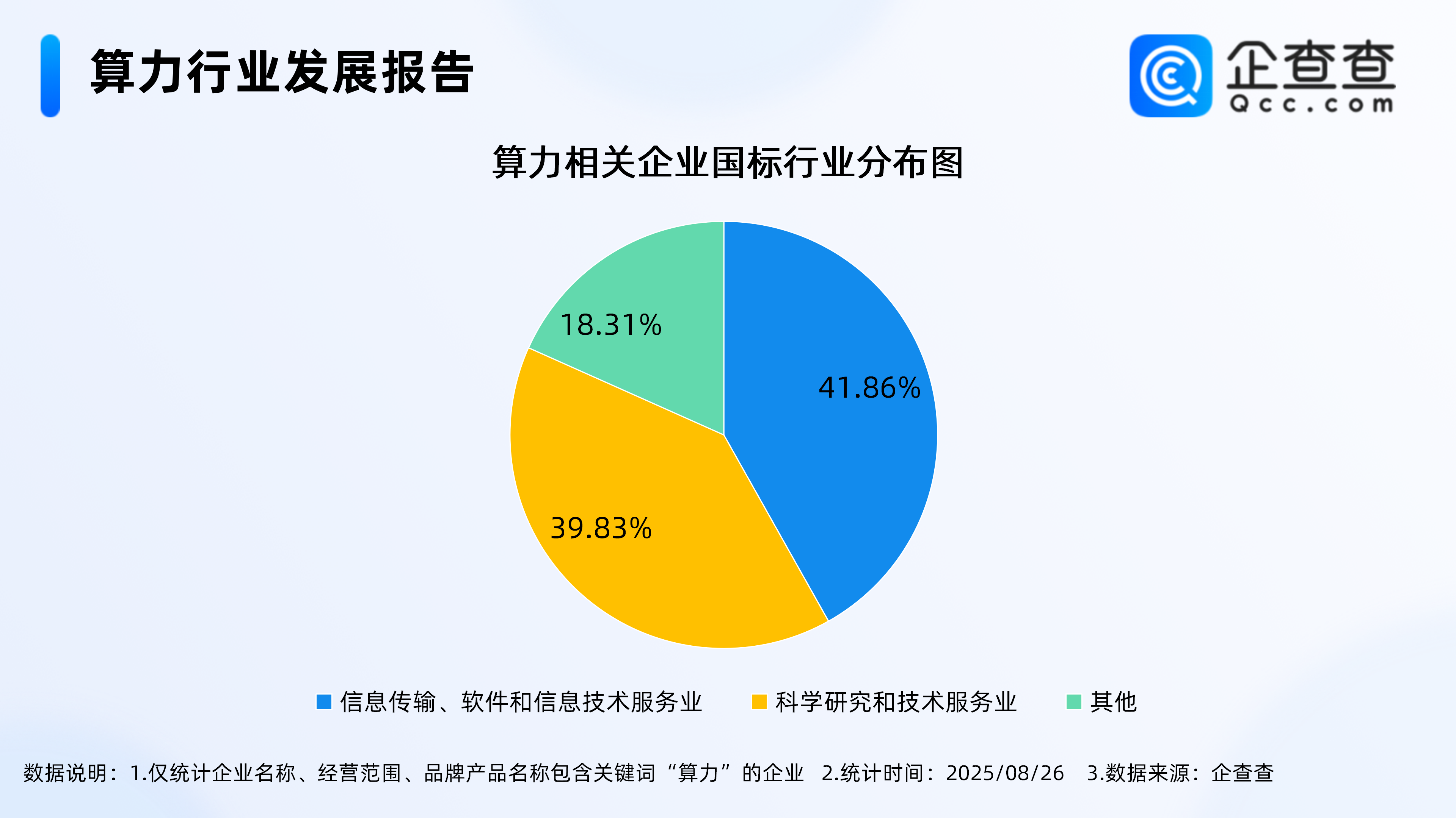 企查查数据显示,从国标行业来看,算力相关企业集中分布在技术密集型行业,主要分布在信息传输、软件和信息技术服务业,以及科学研究和技术服务业,占比分别达41.86%、39.83%。其次,分布在租赁和商务服务业、批发和零售业、制造业等其余国标行业相关企业的占比总和为18.31%。