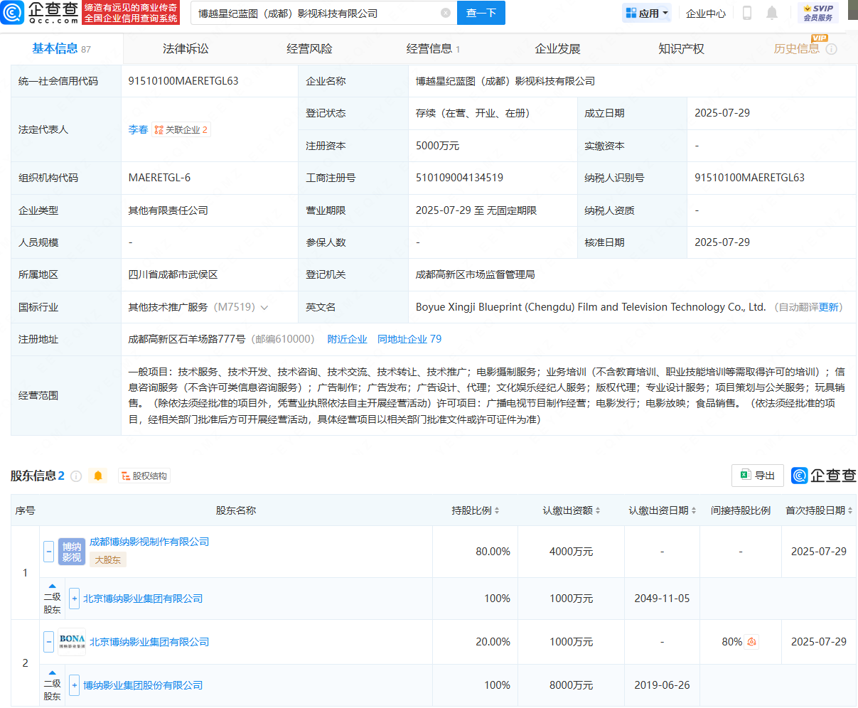 企查查APP显示,近日,博越星纪蓝图(成都)影视科技有限公司成立,法定代表人为李春,注册资本为5000万元,经营范围包含:电影摄制服务;广告制作;广告发布;广告设计、代理;文化娱乐经纪人服务;电影发行;电影放映等。企查查股权穿透显示,该公司由博纳影业(001330)间接全资持股。