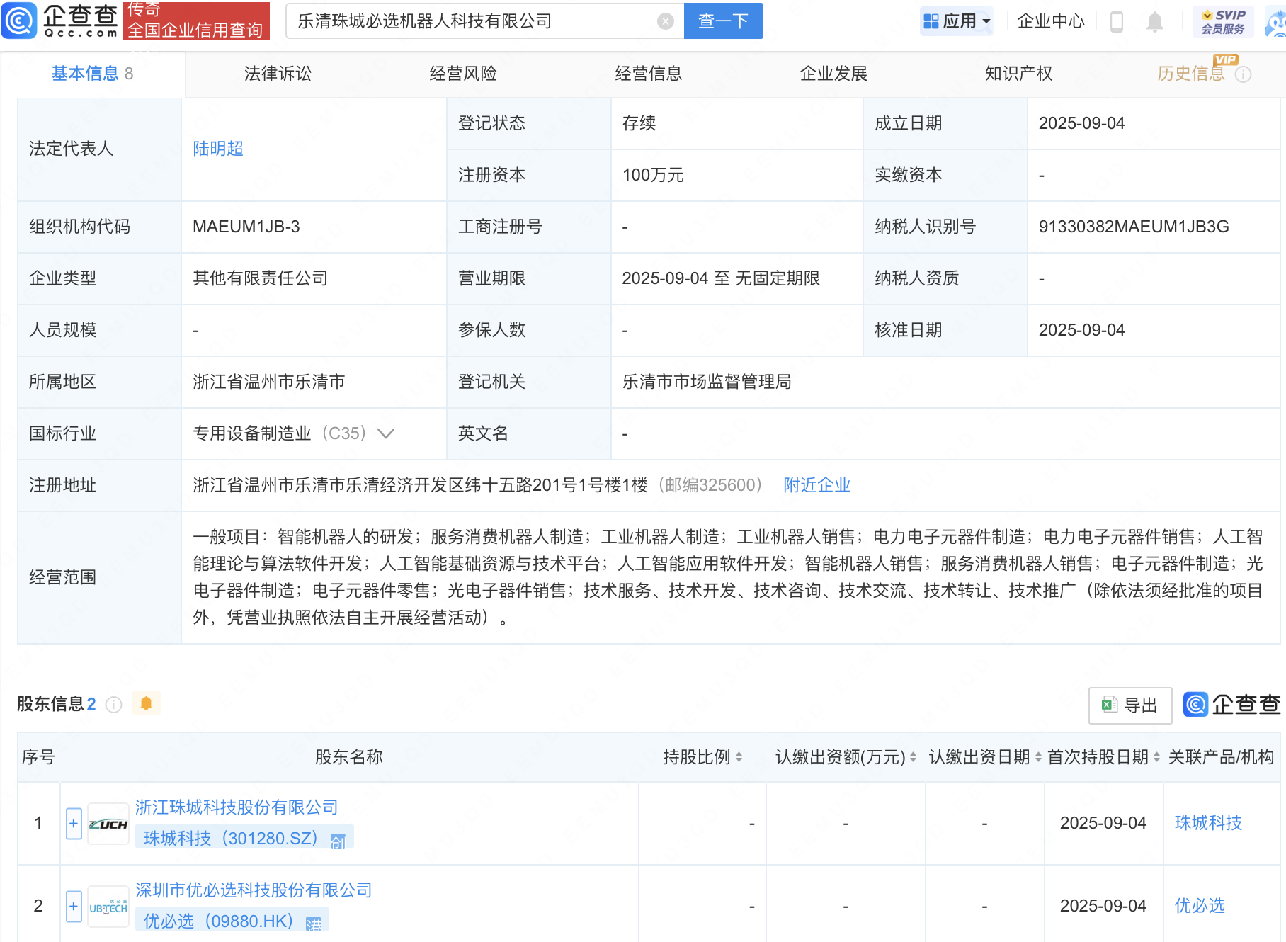 企查查APP显示,近日,乐清珠城必选机器人科技有限公司成立,法定代表人为陆明超,经营范围包含:智能机器人的研发;服务消费机器人制造;人工智能基础资源与技术平台;人工智能应用软件开发等。企查查股权穿透显示,该公司由珠城科技(301280)、优必选(09880.HK)共同持股。