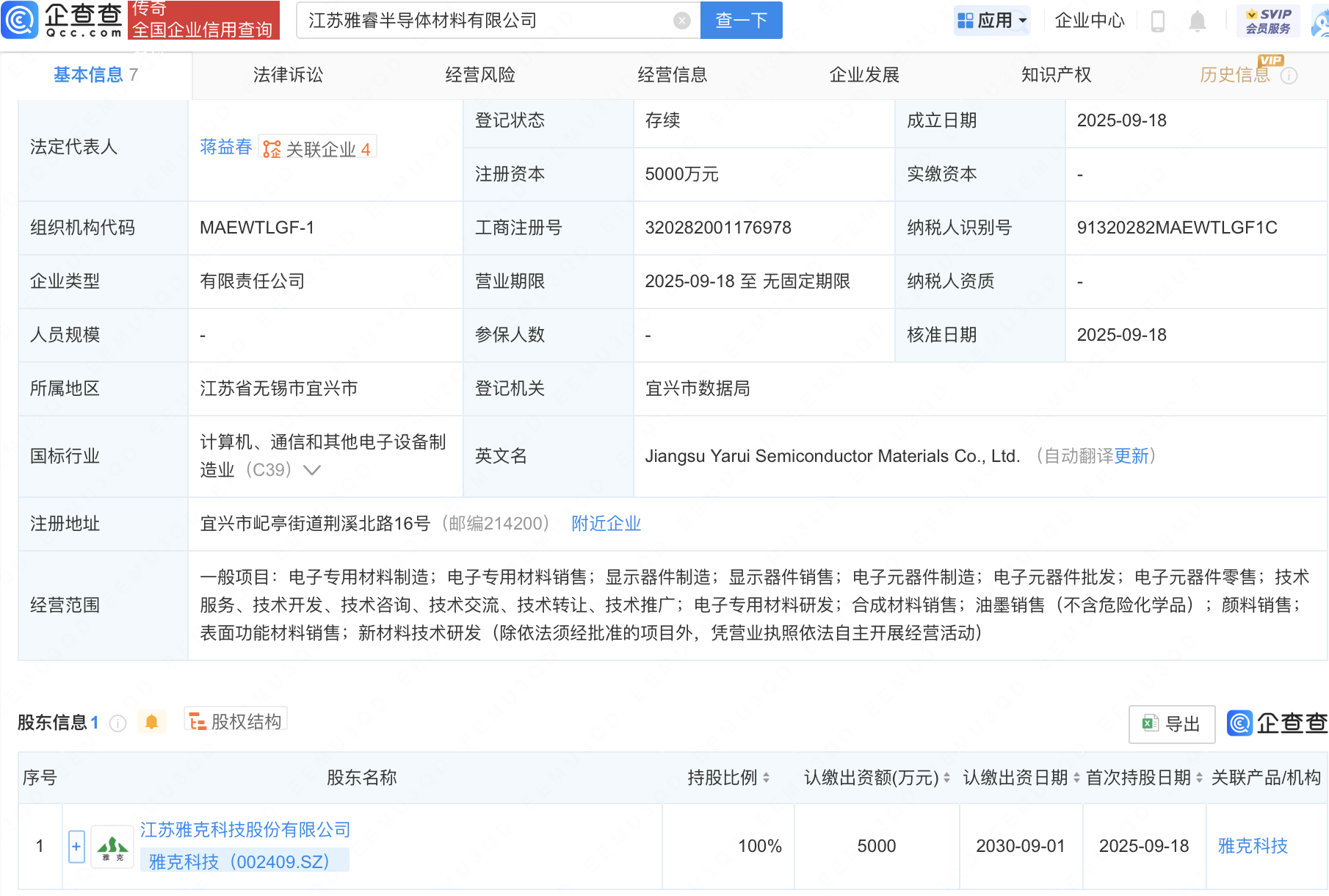 企查查APP显示,近日,江苏雅睿半导体材料有限公司成立,注册资本5000万元,经营范围包含:电子专用材料制造;电子专用材料销售;显示器件制造;显示器件销售等。企查查股权穿透显示,该公司由雅克科技(002409)全资持股。