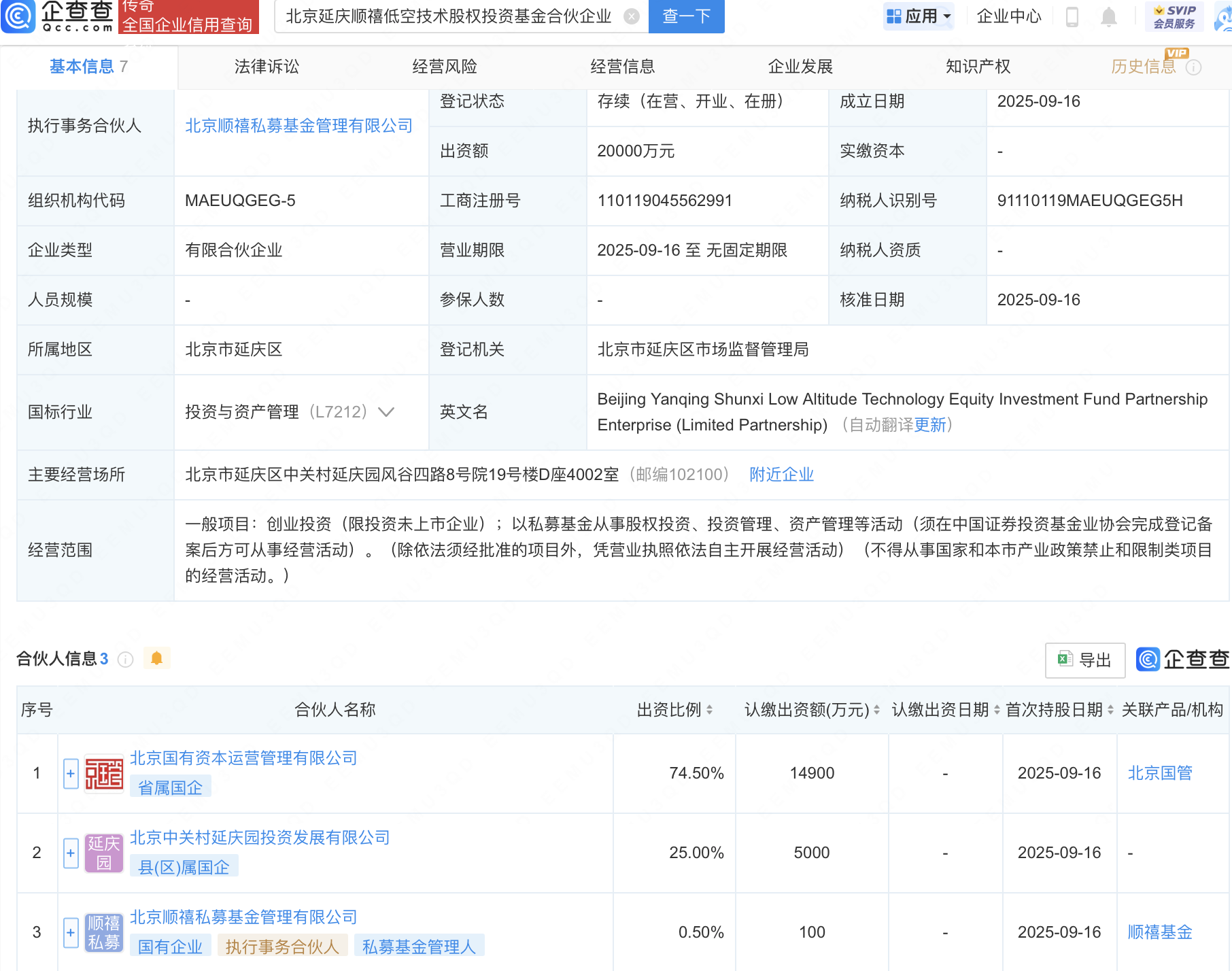 企查查APP显示,近日,北京延庆顺禧低空技术股权投资基金合伙企业(有限合伙)成立,出资额2亿元,经营范围包含:创业投资(限投资未上市企业);以私募基金从事股权投资、投资管理、资产管理等活动。企查查股权穿透显示,该企业由北京国有资本运营管理有限公司、北京中关村延庆园投资发展有限公司等共同出资。