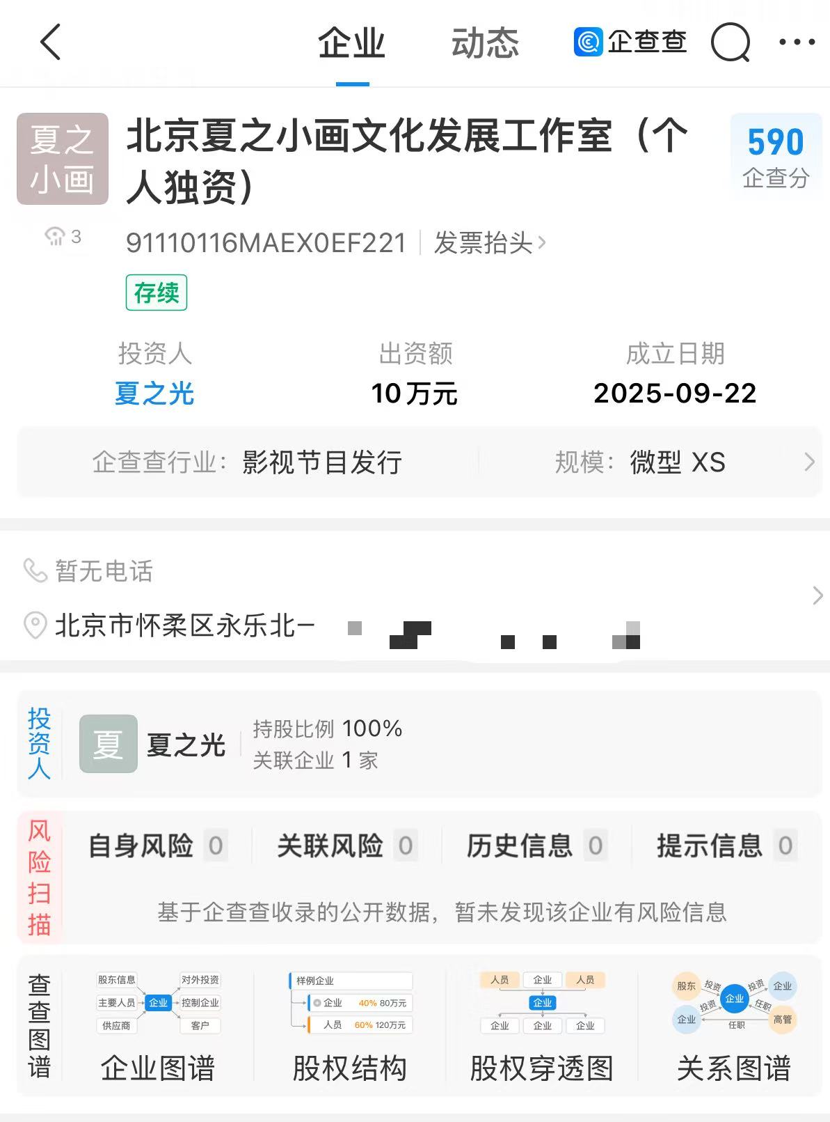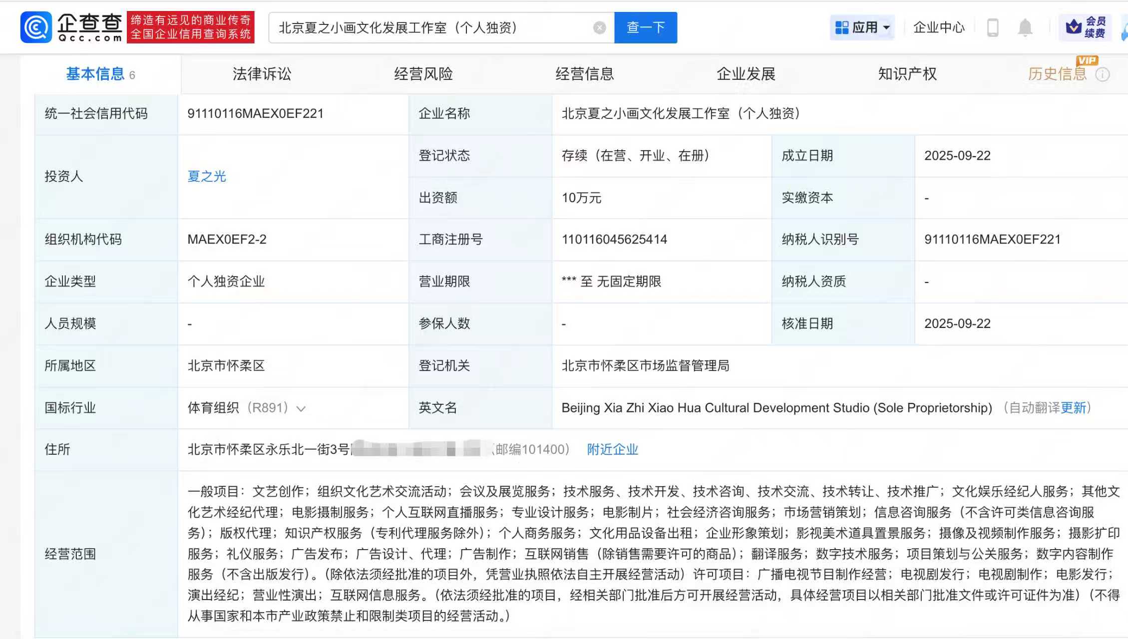 企查查APP显示,近日,北京夏之小画文化发展工作室(个人独资)成立,夏之光为投资人,出资额10万元,经营范围包含文化娱乐经纪人服务、文化娱乐经纪人服务、个人互联网直播服务等。此前,夏之光在某品牌直播中透露自己 “从小学画画”。