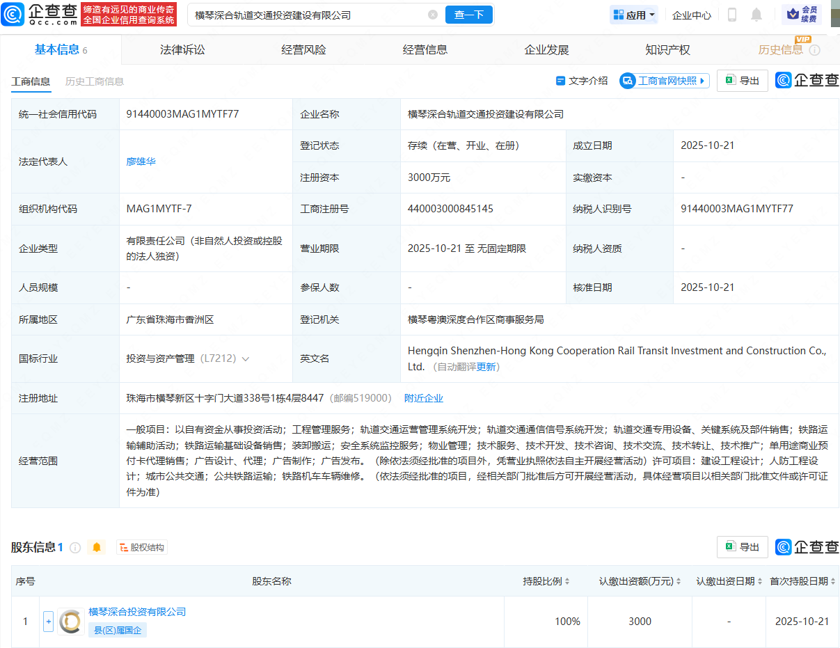 企查查APP显示,近日,横琴深合轨道交通投资建设有限公司成立,法定代表人为廖雄华,注册资本为3000万元,经营范围包含:轨道交通运营管理系统开发;铁路运输辅助活动;铁路运输基础设备销售;装卸搬运;城市公共交通等。企查查股权穿透显示,该公司由横琴深合投资有限公司全资持股。