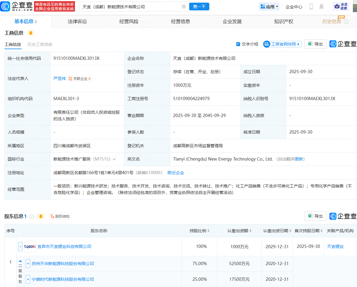 企查查APP显示,近日,天宜(成都)新能源技术有限公司成立,法定代表人为严显伟,注册资本为1000万元,经营范围包含:新兴能源技术研发;专用化学产品销售(不含危险化学品);企业管理咨询等。企查查股权穿透显示,该公司由宜宾市天宜锂业科创有限公司全资持股,后者由天华新能(300390)、宁德时代(300750)间接共同持股。