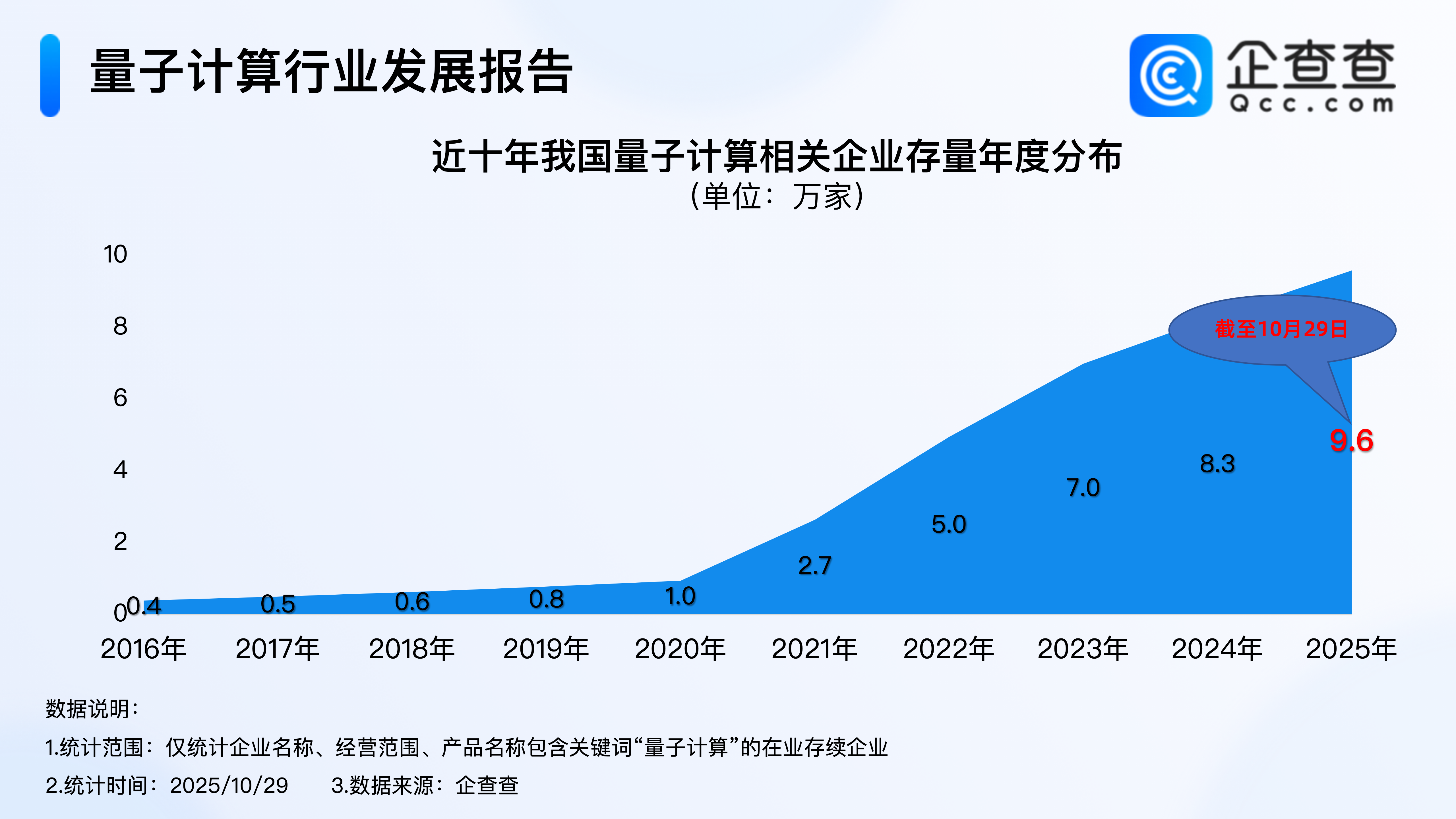 根据企查查数据,我国量子计算赛道于2021年开始加速扩容。截至2025年10月29日,我国现存9.6万家量子计算相关企业,超2021年同期存量的3.6倍。