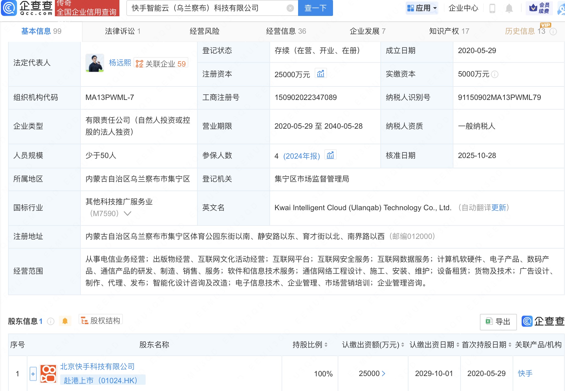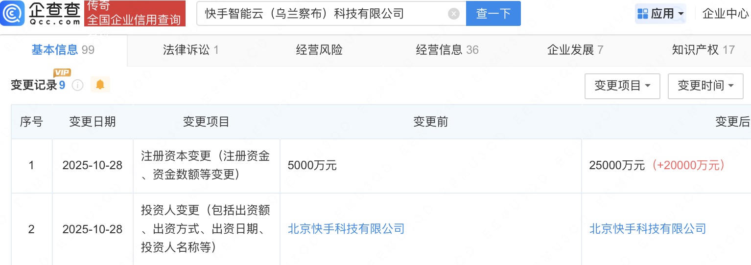 快手旗下智能云科技公司增资至2.5亿,增幅400%