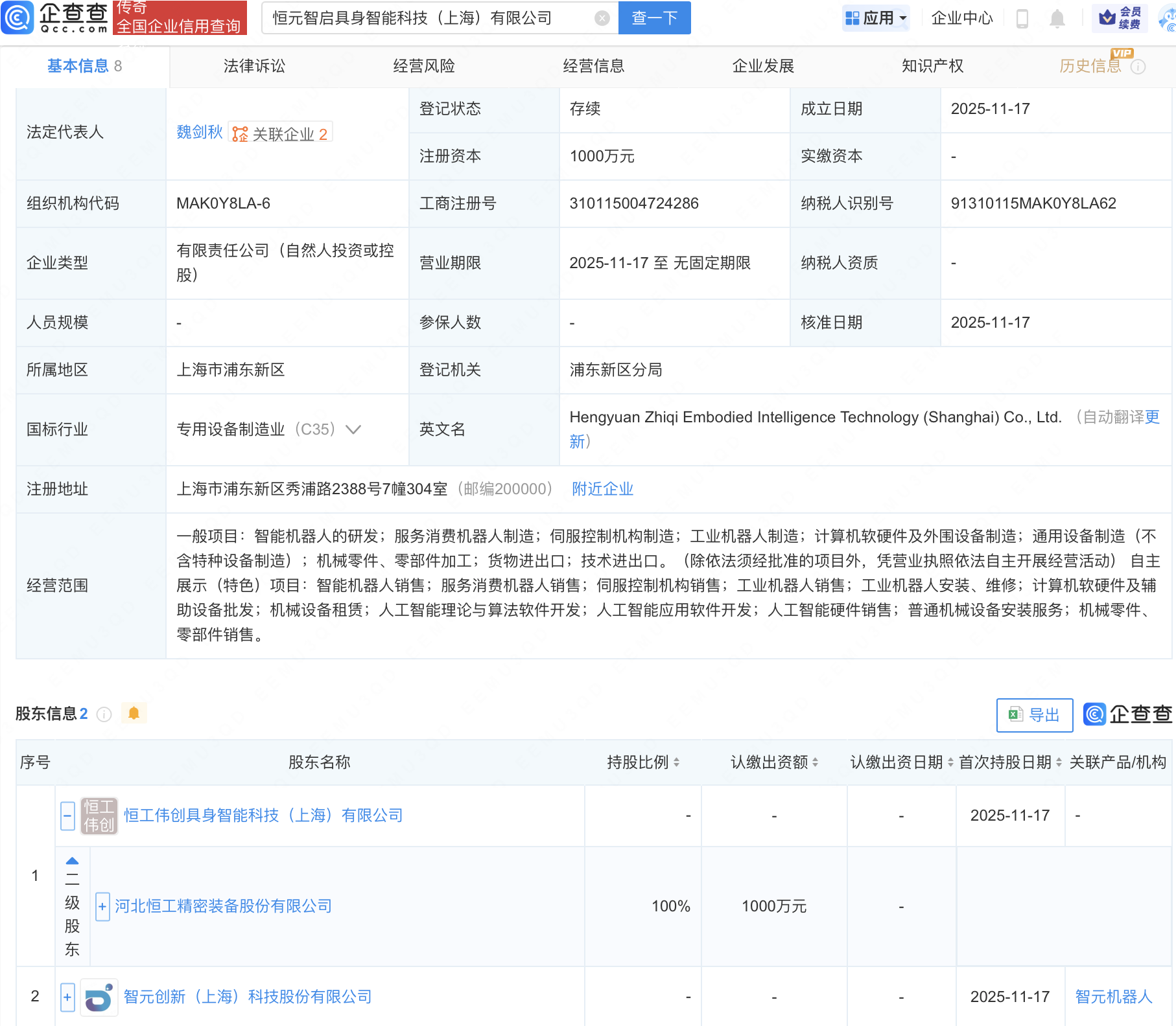 企查查APP显示,近日,恒元智启具身智能科技(上海)有限公司成立,注册资本1000万元,经营范围包含:智能机器人的研发;服务消费机器人制造;人工智能应用软件开发;人工智能硬件销售等。企查查股权穿透显示,该公司由智元机器人关联公司智元创新(上海)科技股份有限公司、恒工精密(301261)全资子公司恒工伟创具身智能科技(上海)有限公司共同持股。