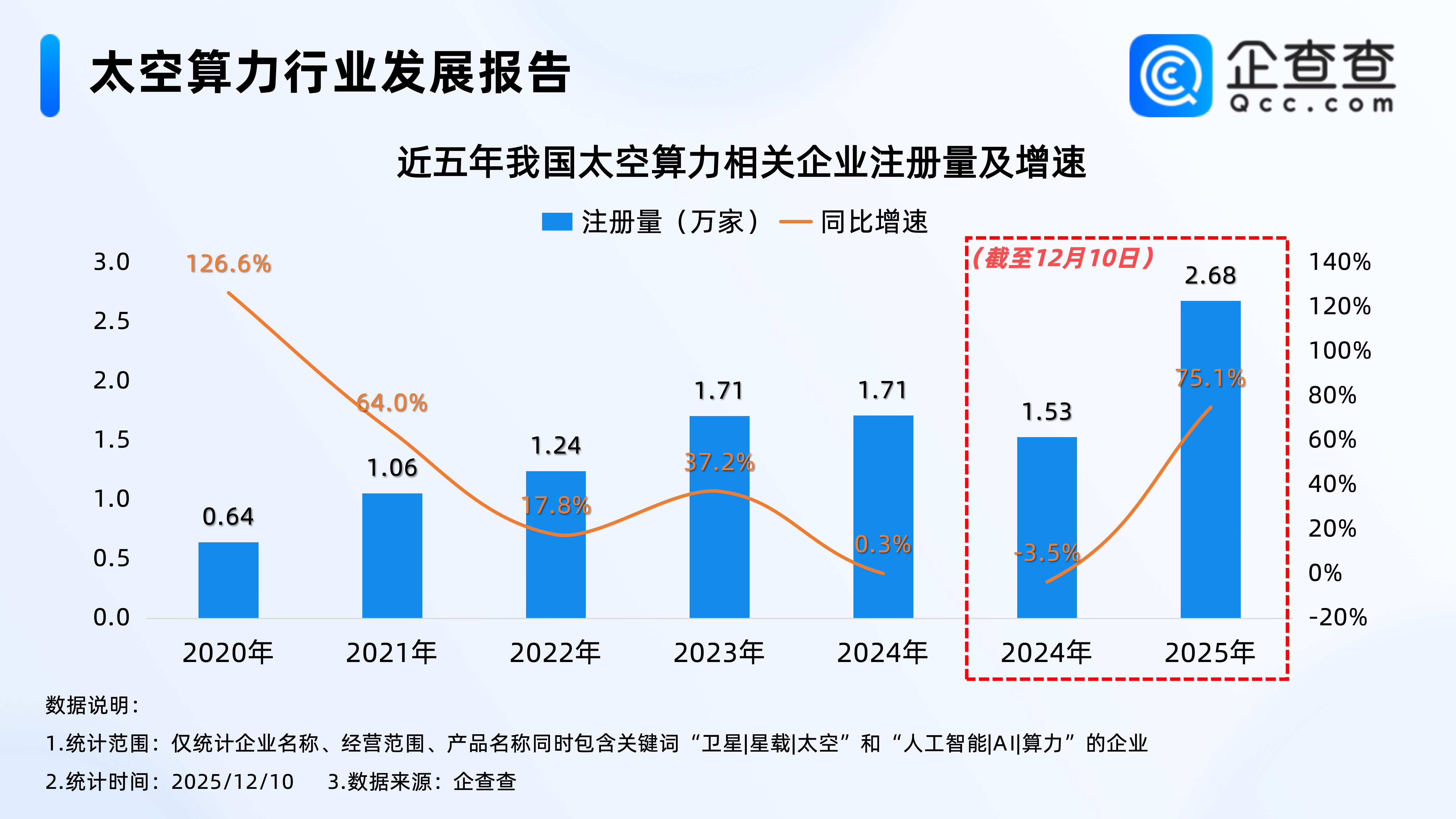 企查查数据显示,2020年以来,我国太空算力相关企业注册量基本逐年增加,2024年我国累计注册1.71万家太空算力相关企业,达近五年注册量峰值;截至12月10日,2025年我国已注册2.68万家太空算力相关企业,已超2024年全年,相比2024年同期大幅增加75.1%。