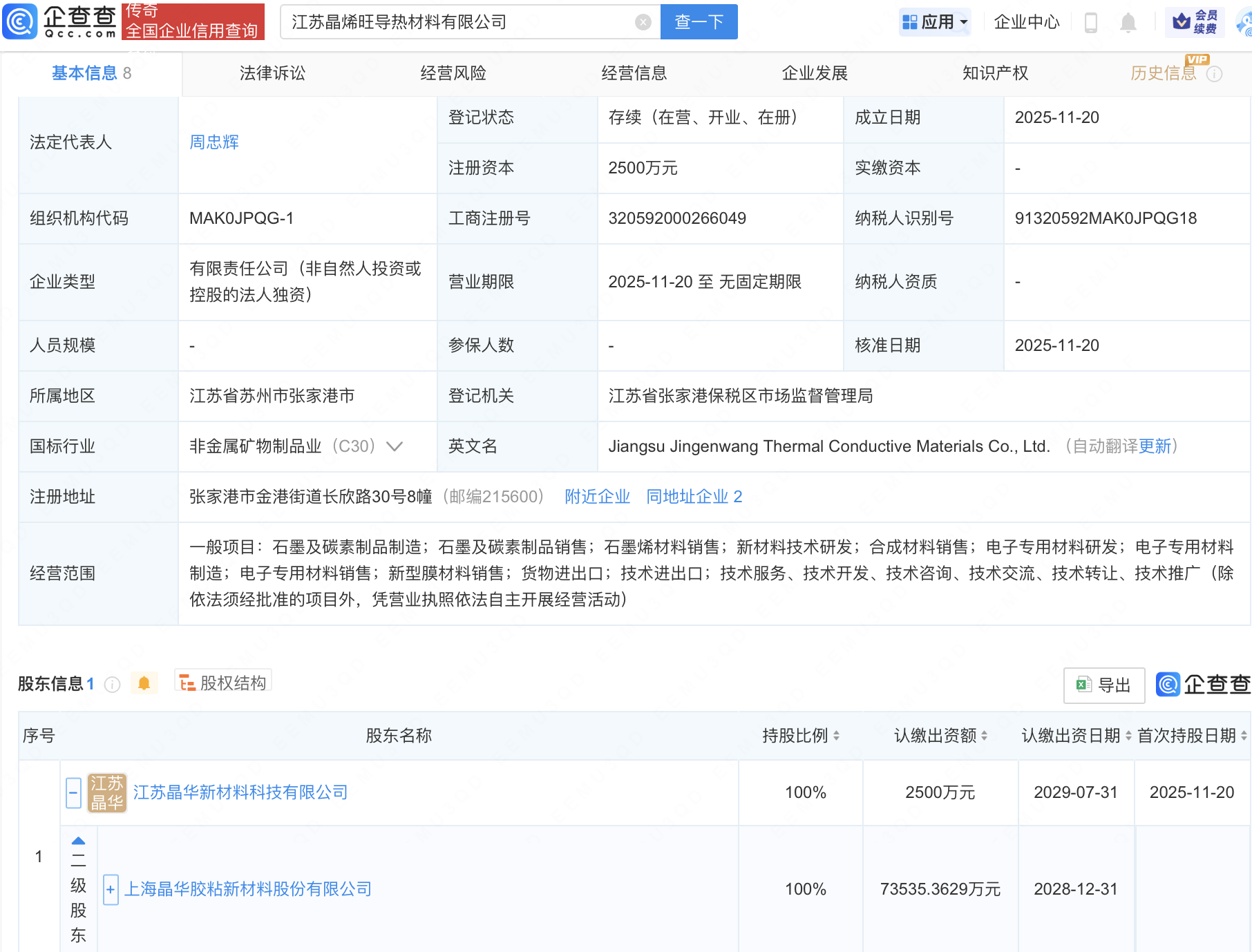 企查查APP显示,近日,江苏晶烯旺导热材料有限公司成立,注册资本2500万元,经营范围包含:石墨及碳素制品制造;石墨及碳素制品销售;石墨烯材料销售;新材料技术研发等。企查查股权穿透显示,该公司由晶华新材(603683)间接全资持股。