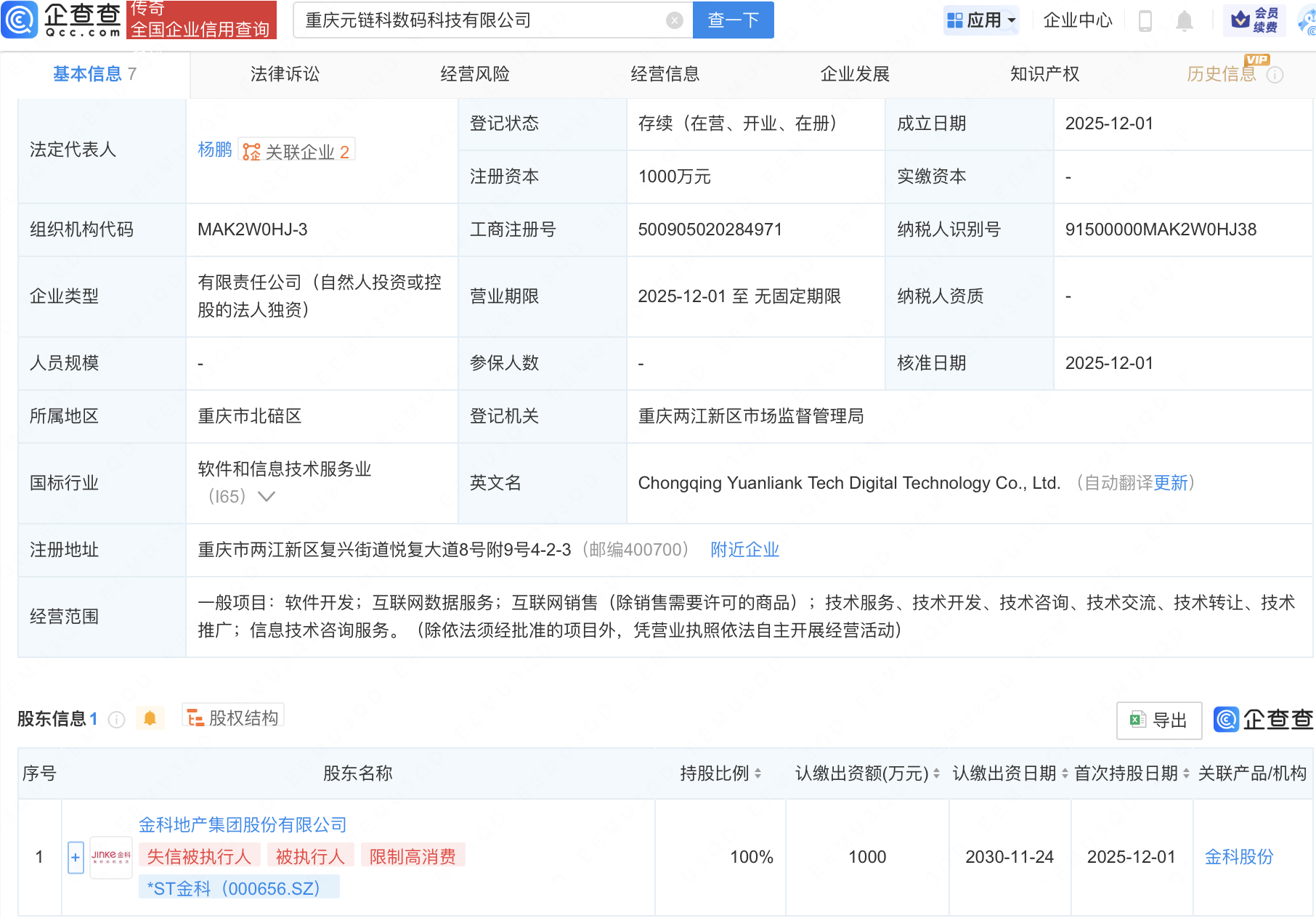 企查查APP显示,近日,重庆元链科数码科技有限公司成立,注册资本1000万元,经营范围包含:软件开发;互联网数据服务;互联网销售(除销售需要许可的商品)等。企查查股权穿透显示,该公司由*ST金科(000656)全资持股。