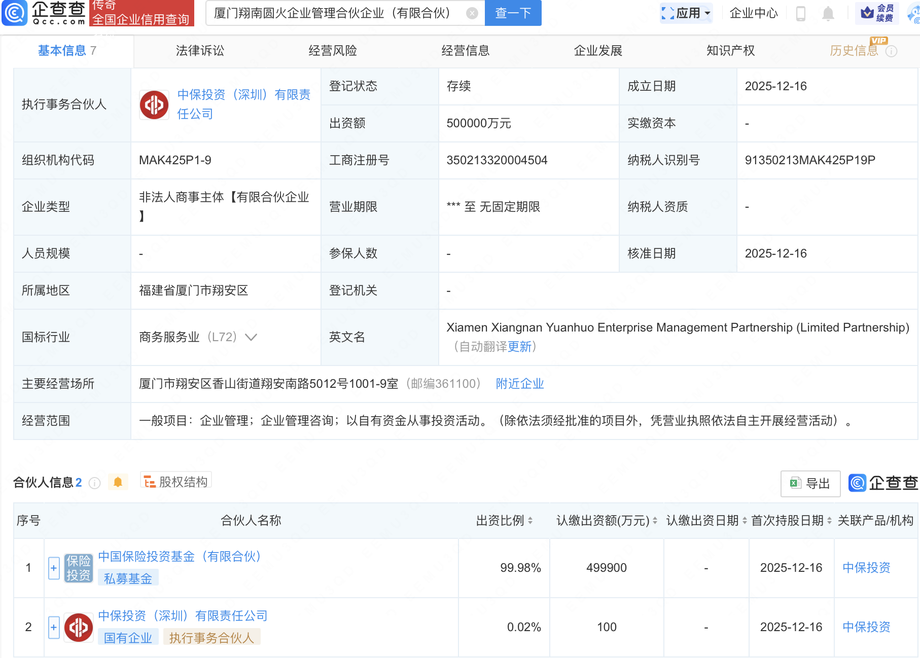 企查查APP显示,近日,厦门翔南圆火企业管理合伙企业(有限合伙)成立,出资额50亿元,经营范围包含:企业管理;企业管理咨询;以自有资金从事投资活动。企查查股权穿透显示,该企业由中国保险投资基金(有限合伙)、中保投资(深圳)有限责任公司共同出资。
