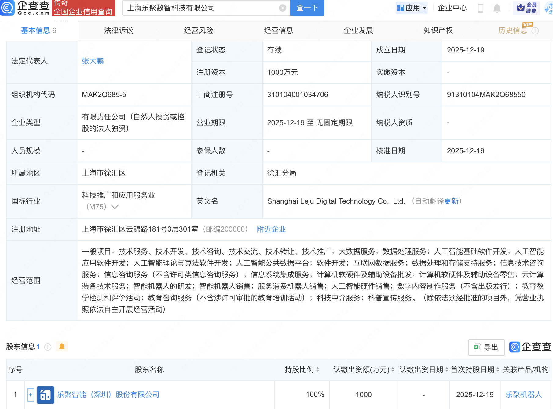 企查查APP显示,近日,上海乐聚数智科技有限公司成立,注册资本1000万元,经营范围包含:人工智能基础软件开发;人工智能应用软件开发;人工智能理论与算法软件开发;人工智能公共数据平台等。企查查股权穿透显示,该公司由乐聚机器人关联公司乐聚智能(深圳)股份有限公司全资持股。