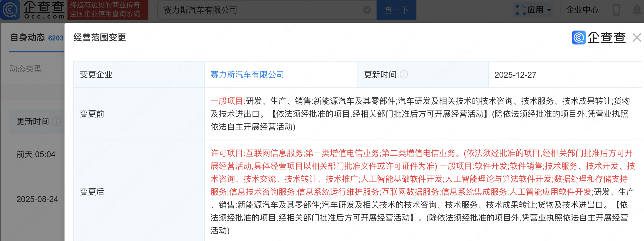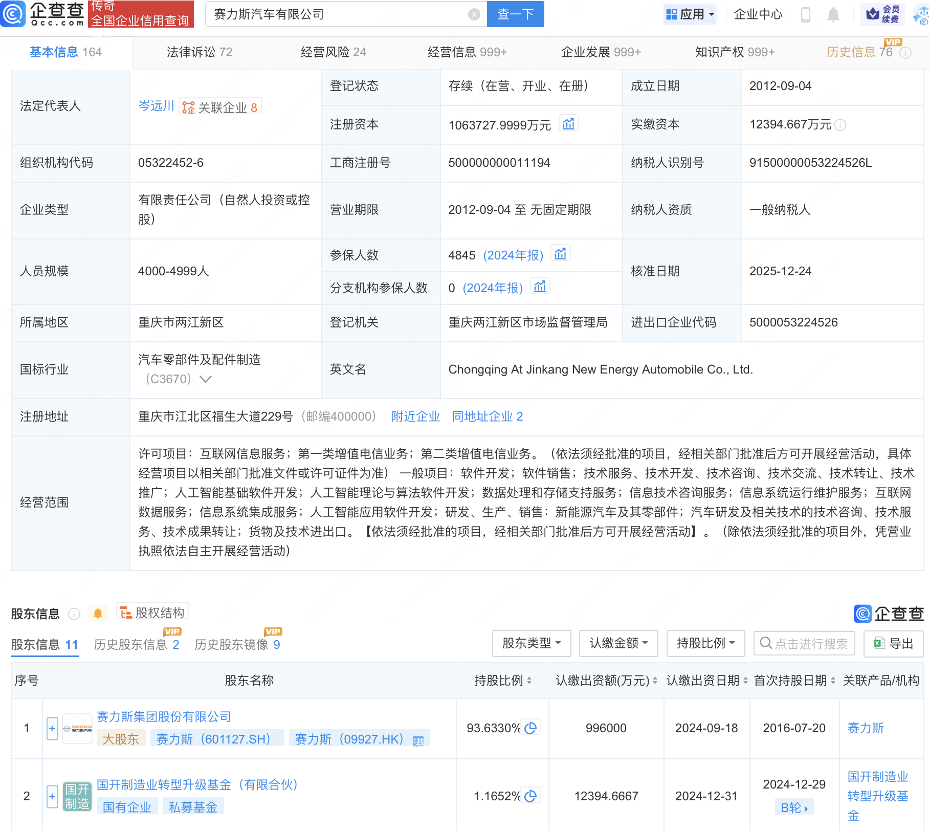 企查查APP显示,近日,赛力斯汽车有限公司发生工商变更,经营范围新增人工智能基础软件开发;人工智能理论与算法软件开发;人工智能应用软件开发等。企查查信息显示,该公司成立于2012年,由赛力斯(601127)持股93.63%。