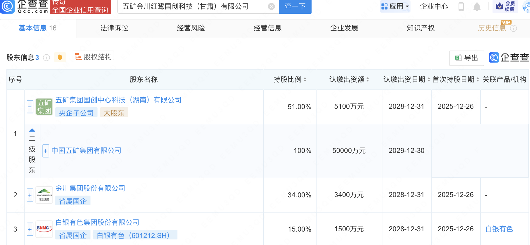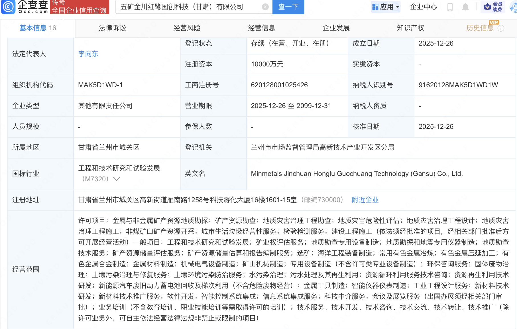 企查查APP显示,近日,五矿金川红鹭国创科技(甘肃)有限公司成立,注册资本1亿元,经营范围包含:金属与非金属矿产资源地质勘探;矿产资源勘查;地质灾害治理工程勘查;地质灾害危险性评估等。企查查股权穿透显示,该公司由中国五矿集团有限公司全资子公司五矿集团国创中心科技(湖南)有限公司、白银有色(601212)等共同持股。