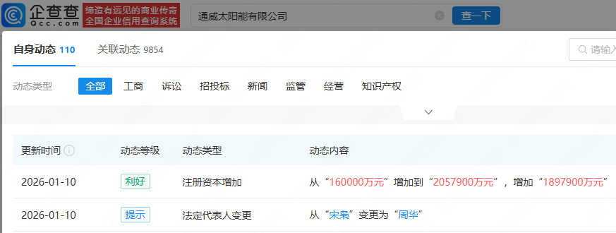 企查查APP显示,近日,通威太阳能有限公司发生工商变更,注册资本由16亿元增至205.79亿元,增幅约1186%,同时,法定代表人由宋枭变更为周华。