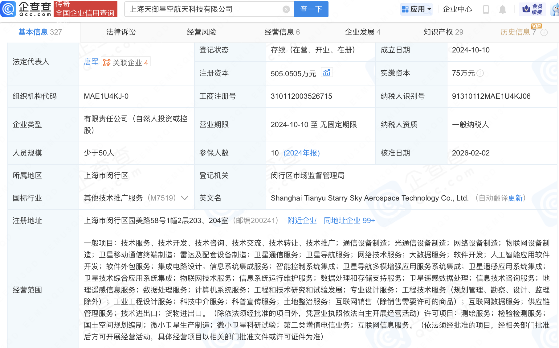 企查查APP显示,近日,上海天御星空航天科技有限公司发生工商变更,新增创远信科(920961)为股东,同时注册资本增至505.05万元。企查查信息显示,该公司成立于2024年,经营范围包含:卫星导航多模增强应用服务系统集成;卫星遥感应用系统集成;卫星技术综合应用系统集成;微小卫星生产制造等。