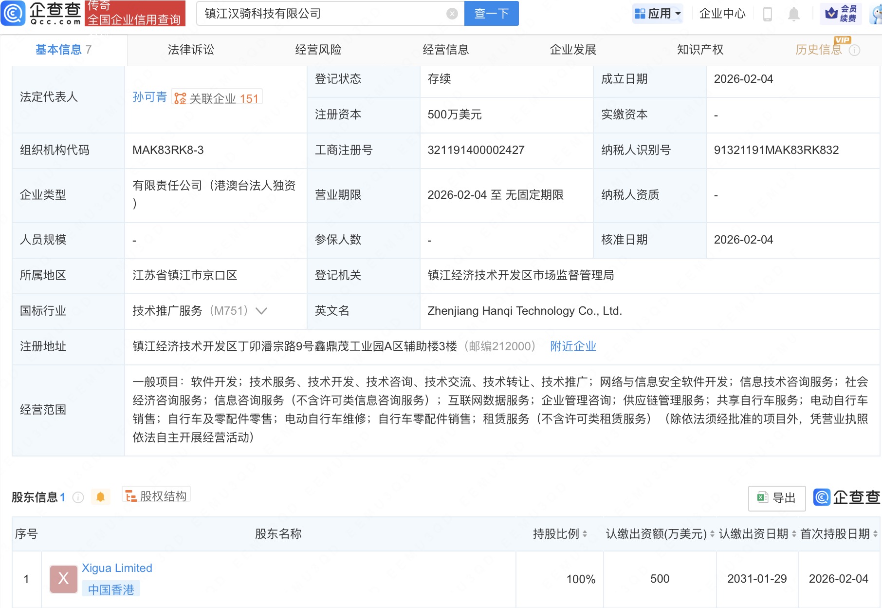 企查查APP显示,近日,镇江汉骑科技有限公司成立,法定代表人为孙可青,注册资本500万美元,经营范围含软件开发、网络与信息安全软件开发、信息技术咨询服务、信息咨询服务、互联网数据服务等。企查查股权穿透显示,该公司由美团旗下Xigua Limited全资持股。