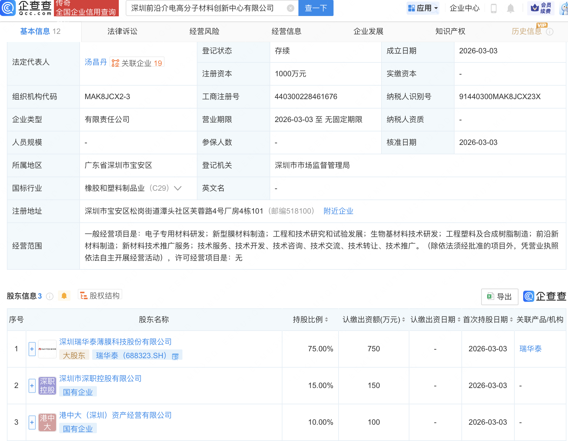 企查查APP显示,近日,深圳前沿介电高分子材料创新中心有限公司成立,注册资本1000万元,经营范围包含:电子专用材料研发;新型膜材料制造;生物基材料技术研发;前沿新材料制造等。企查查股权穿透显示,该公司由瑞华泰(688323)等共同持股。