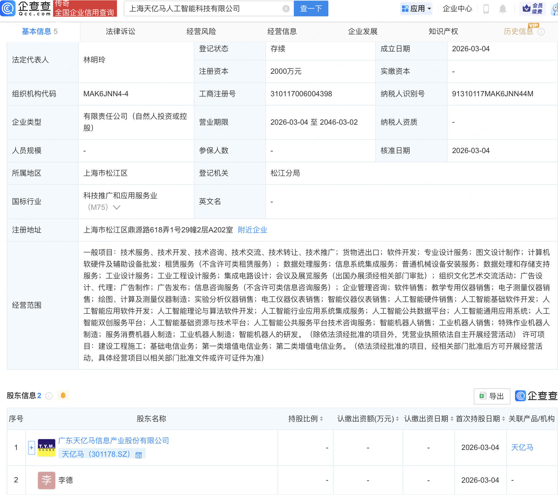 企查查APP显示,近日,上海天亿马人工智能科技有限公司成立,注册资本2000万元,经营范围包含:人工智能应用软件开发;人工智能理论与算法软件开发;人工智能行业应用系统集成服务;智能机器人销售等。企查查股权穿透显示,该公司由天亿马(301178)等共同持股。