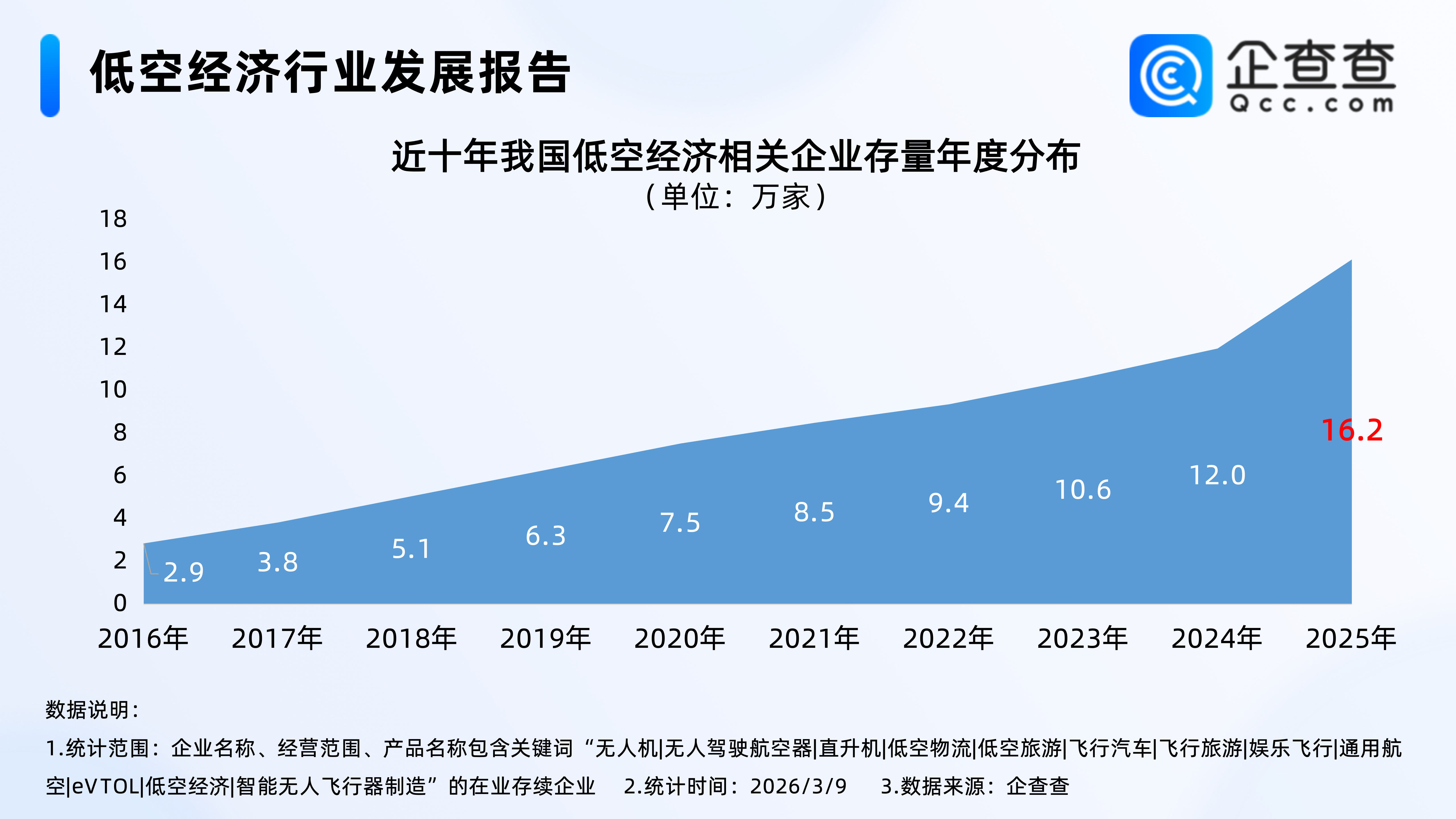 企查查数据显示,近十年,我国低空经济相关企业存量逐年增加,2023年相关企业存量正式突破10万家,达10.6万家;2025年我国低空经济相关企业存量增速加快,年底在业存续16.2万家低空经济相关企业。截至2026年3月9日,我国现存16.6万家低空经济相关企业。