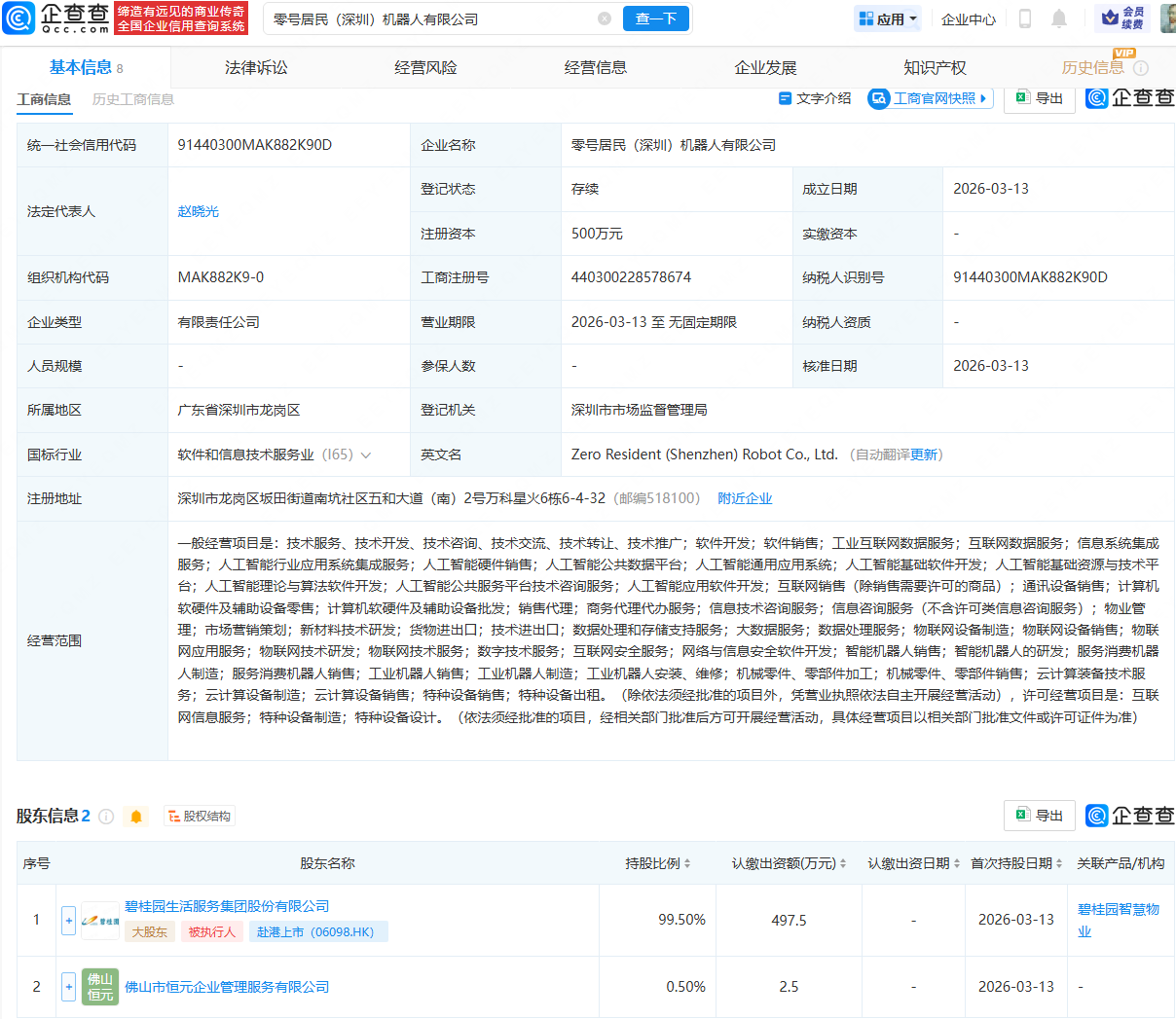 企查查APP显示,近日,零号居民(深圳)机器人有限公司成立,法定代表人为赵晓光,经营范围包含:工业互联网数据服务;人工智能硬件销售;人工智能通用应用系统;智能机器人销售;智能机器人的研发等。企查查股权穿透显示,该公司由碧桂园生活服务集团股份有限公司、佛山市恒元企业管理服务有限公司共同持股。