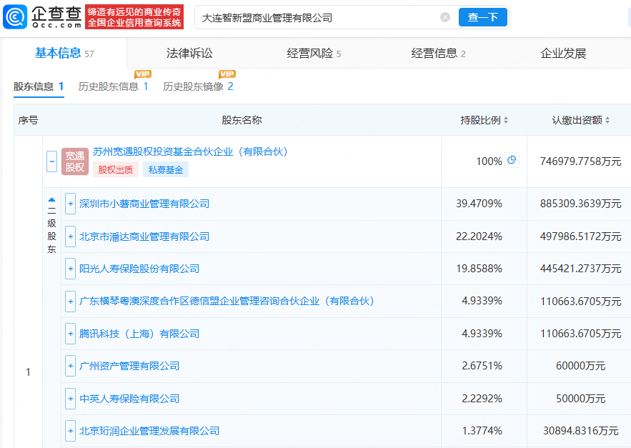 企查查显示,大连智新盟商业管理有限公司由苏州宽遇股权投资基金合伙企业(有限合伙)全资持股,后者由阳光人寿保险股份有限公司、腾讯科技(上海)有限公司、中英人寿保险有限公司等共同持股。