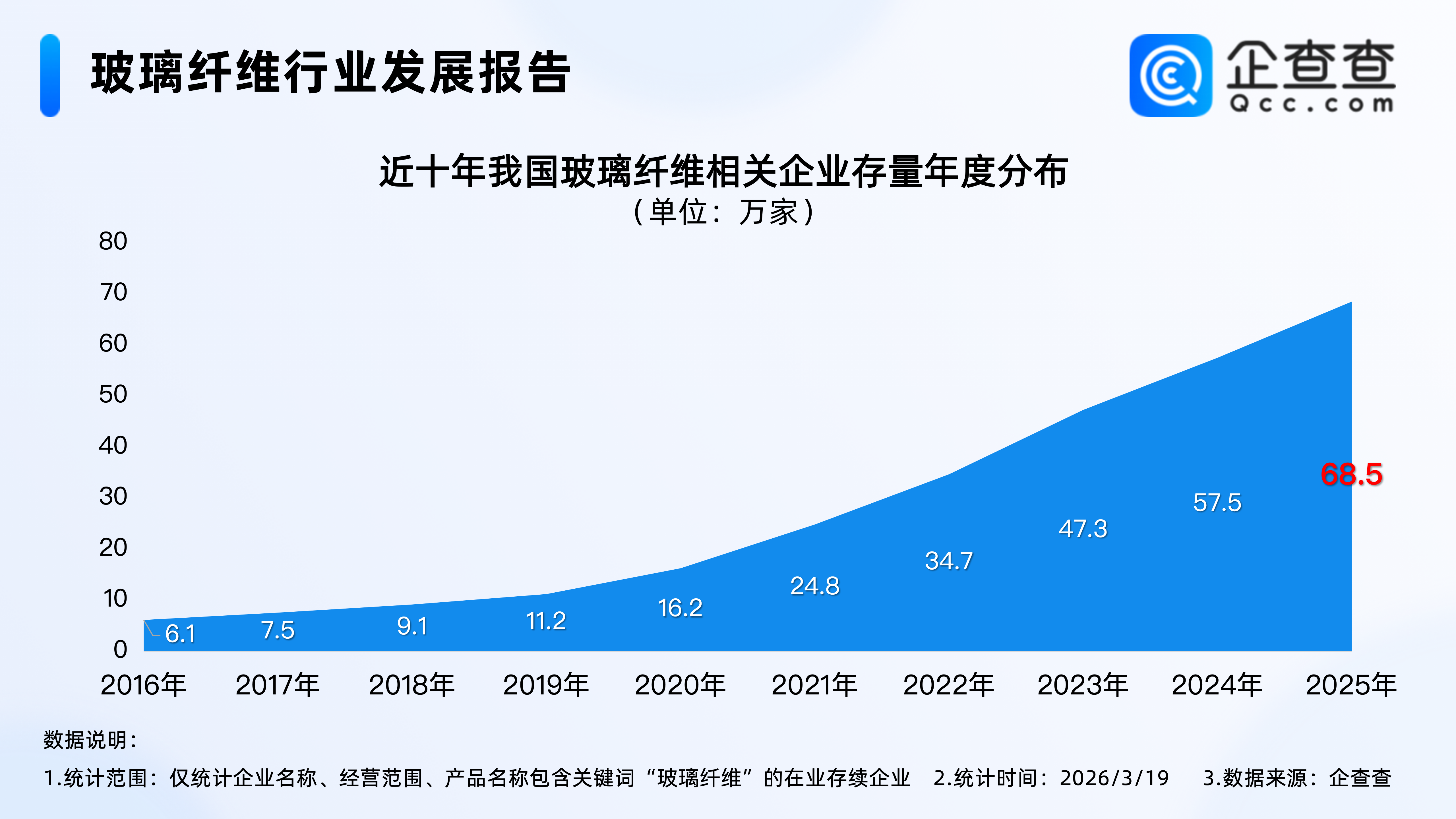 企查查数据显示,近十年,我国玻璃纤维相关企业存量逐年增加,2025年年底,我国在业存续68.5万家玻璃纤维相关企业。截至2026年3月19日,我国现存70.6万家玻璃纤维相关企业。