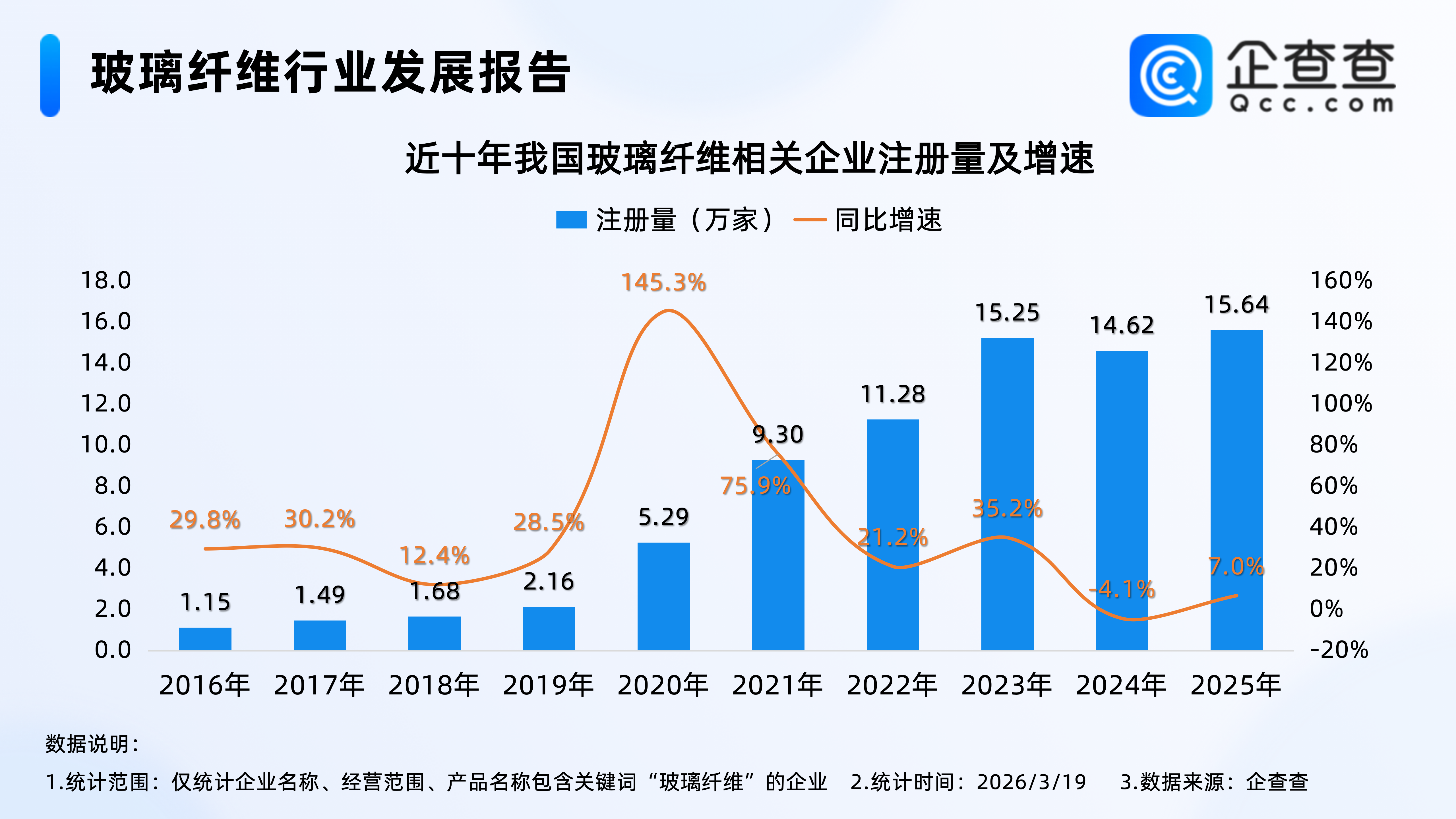 企查查数据显示,近十年,我国玻璃纤维相关企业注册量基本逐年增加,其中2020年注册量同比大幅增加145.3%至5.29万家,达近十年注册量增速峰值,2025年全年,我国累计注册15.64万家玻璃纤维相关企业,同比增加7.0%。截至3月19日,2026年我国已注册2.86万家玻璃纤维相关企业。