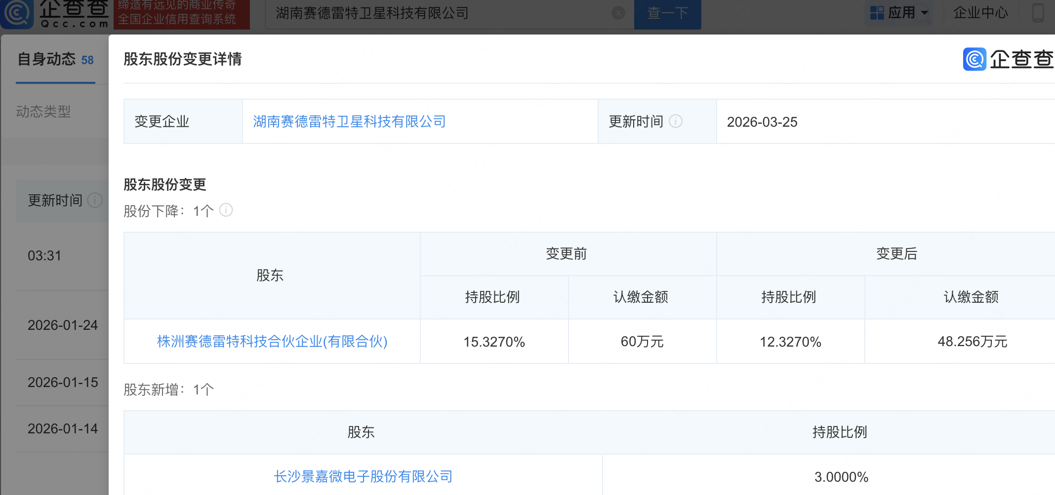 企查查APP显示,近日,湖南赛德雷特卫星科技有限公司发生工商变更,新增景嘉微(300474)为股东。企查查信息显示,该公司成立于2018年,注册资本391.47万元,经营范围包含:微小卫星测运控服务;微小卫星生产制造;卫星遥感应用系统集成;卫星移动通信终端制造等。