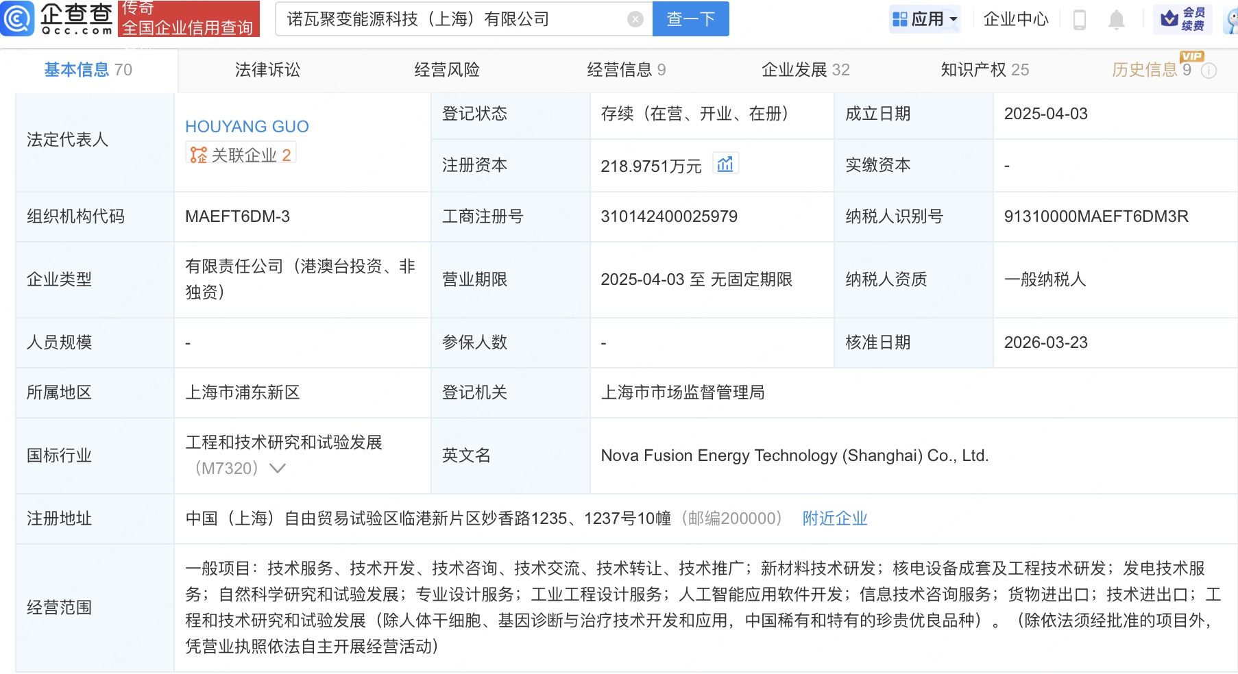 企查查APP显示,近日,诺瓦聚变能源科技(上海)有限公司发生工商变更,新增阿里巴巴旗下杭州灏月企业管理有限公司、上汽旗下河南尚颀汇融尚成一号产业基金合伙企业(有限合伙)等为股东,同时注册资本由约170.3万人民币增至约219万人民币。企查查信息显示,该公司成立于2025年4月,法定代表人为HOUYANG GUO,经营范围含新材料技术研发、核电设备成套及工程技术研发、发电技术服务等。公开资料显示,该公司专注于研发小型、分布式、模块化核聚变装置。