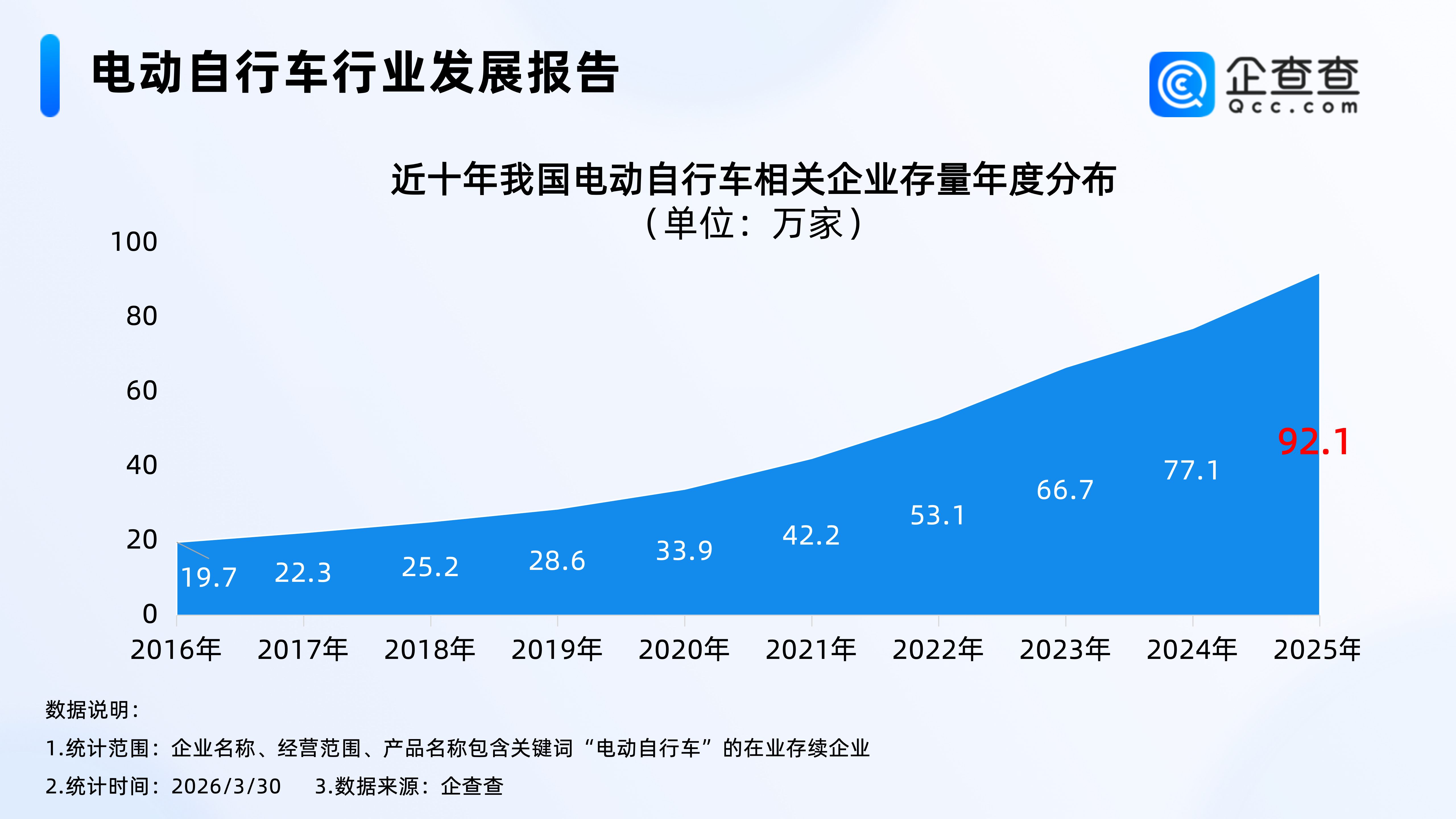 企查查数据显示,2016年以来,我国电动自行车相关企业存量逐年增加,于2022年首次突破50万家,截至2026年3月30日,我国现存94.9万家电动自行车相关企业。