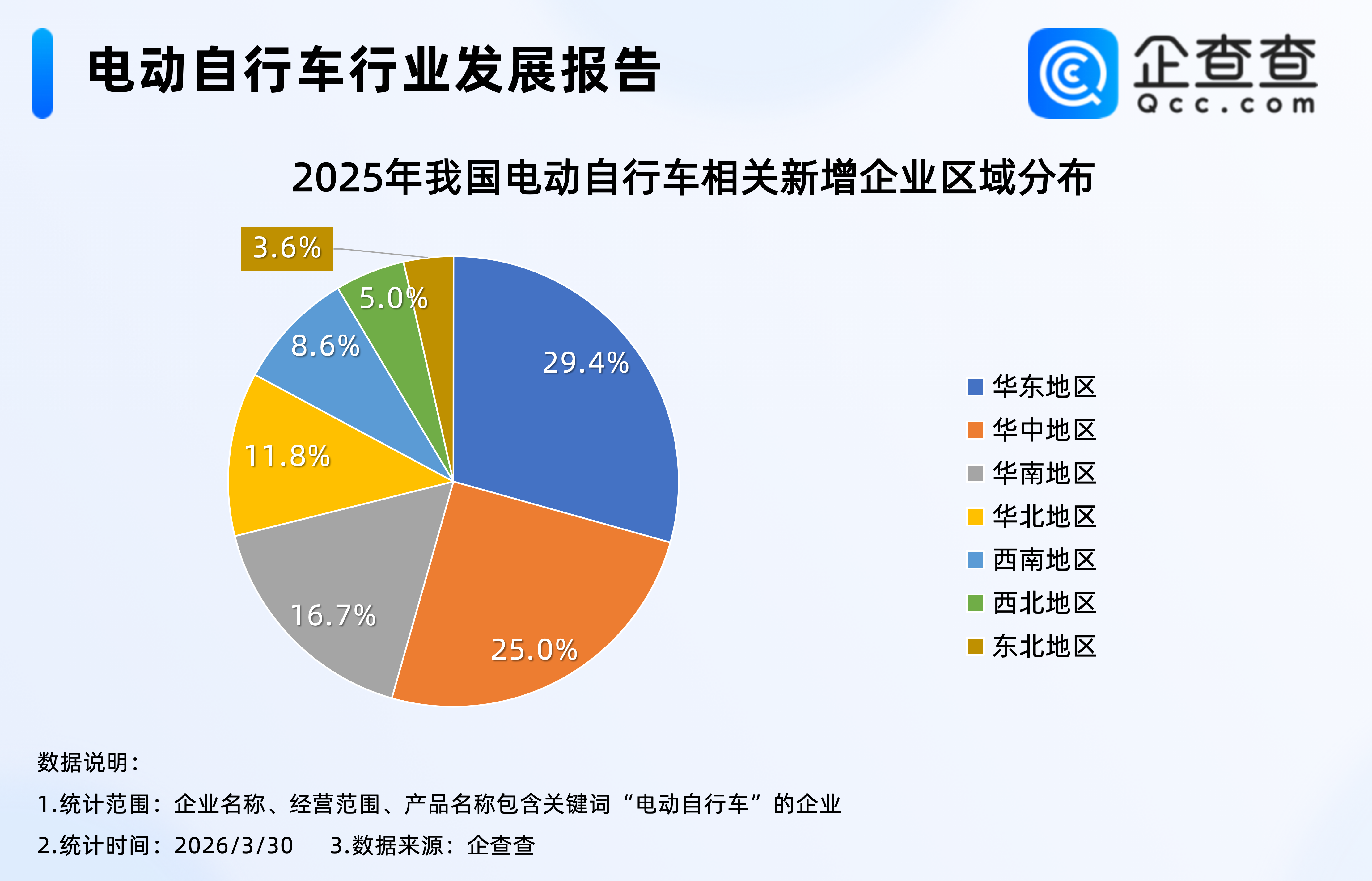 企查查数据显示,截至3月30日,我国现存94.9万家电动自行车相关企业。注册量方面,2025年全年,我国电动自行车相关企业注册量同比增加23.4%至22.1万家,创近十年注册量新高。区域分布上,华东地区2025年注册量最多,占比29.4%,其次是华中地区,占比25.0%。截至3月30日,2026年我国已注册超4万家电动自行车相关企业。
