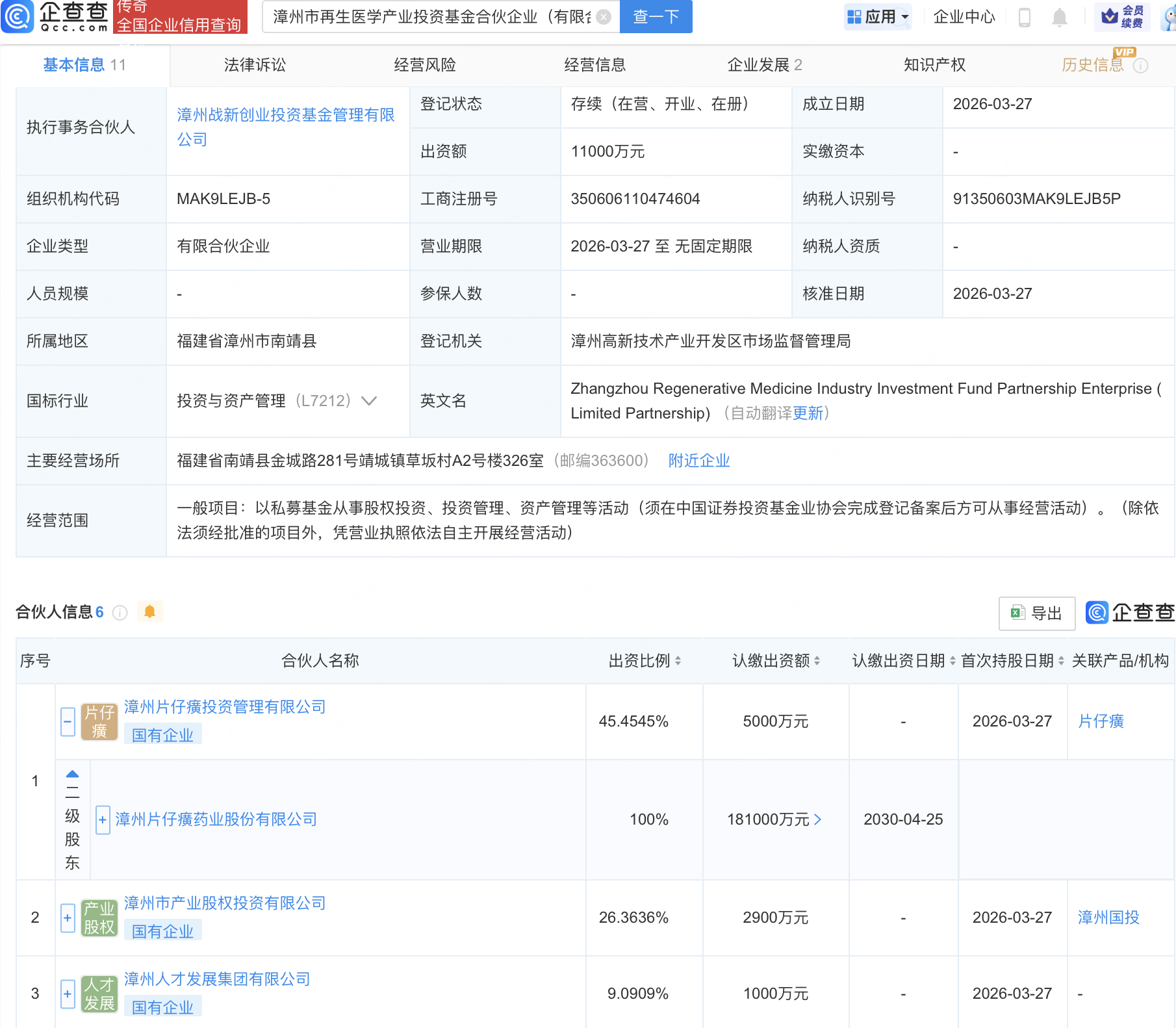 企查查APP显示,近日,漳州市再生医学产业投资基金合伙企业(有限合伙)成立,出资额1.1亿元,经营范围包含:以私募基金从事股权投资、投资管理、资产管理等活动。企查查股权穿透显示,该企业由片仔癀(600436)全资子公司漳州片仔癀投资管理有限公司等共同出资。