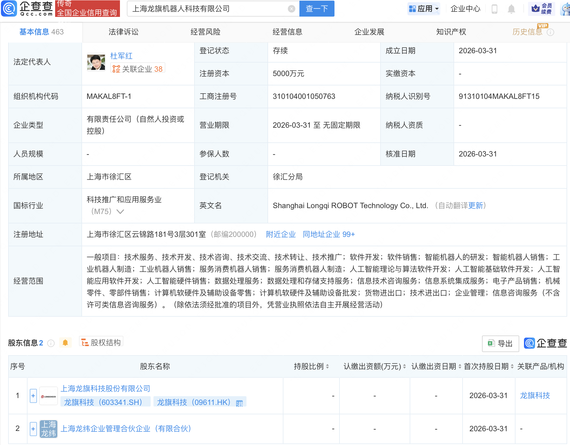 企查查APP显示,近日,上海龙旗机器人科技有限公司成立,注册资本5000万元,经营范围包含:智能机器人的研发;智能机器人销售;人工智能理论与算法软件开发;人工智能基础软件开发;人工智能应用软件开发等。企查查股权穿透显示,该公司由龙旗科技(603341)等共同持股。