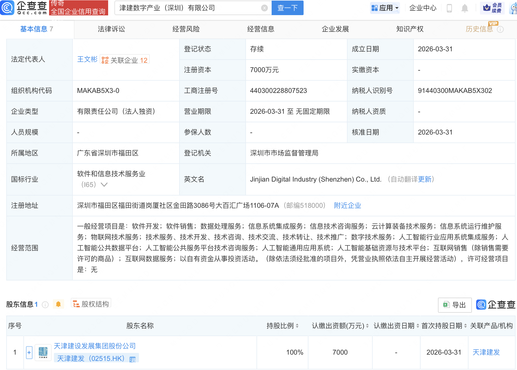 企查查APP显示,近日,津建数字产业(深圳)有限公司成立,注册资本7000万元,经营范围包含:人工智能行业应用系统集成服务;人工智能公共数据平台;人工智能公共服务平台技术咨询服务;人工智能通用应用系统等。企查查股权穿透显示,该公司由天津建发(02515.HK)全资持股。