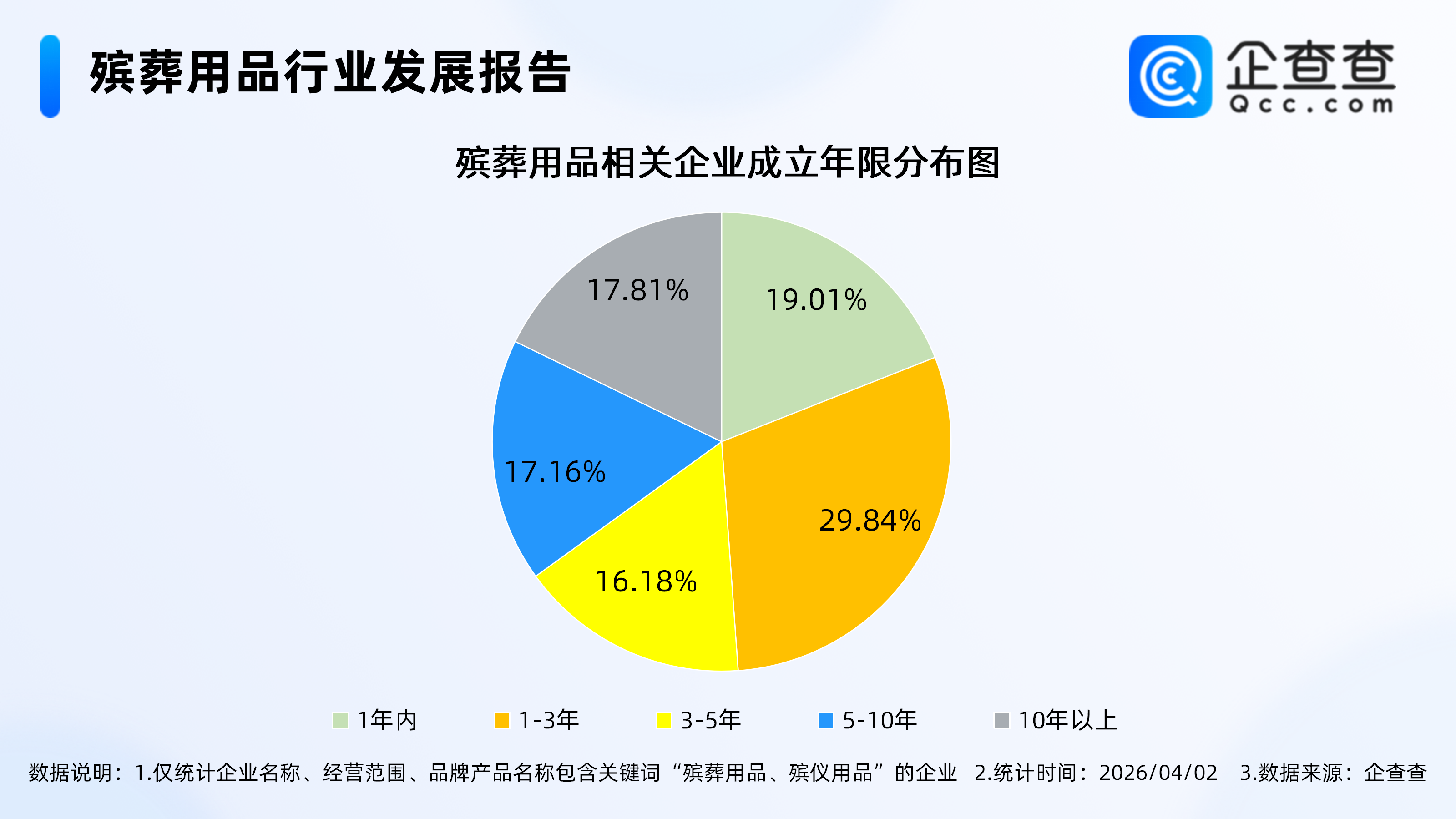 企查查数据显示,截至4月2日,国内现存殡葬用品相关企业36.8万家。注册量方面,近十年殡葬用品相关企业注册量持续增长:2016年仅1.09万家,2025年已飙升至7.91万家。此外,截至目前,今年已注册1.7万家相关企业。增速层面,行业经历两轮爆发期,2021年注册增速达42.23%,2023年注册增速再创新高至43.97%,即使在注册增速放缓的2024年,注册量仍达6.61万家,2025年注册增速回升至19.66%。
