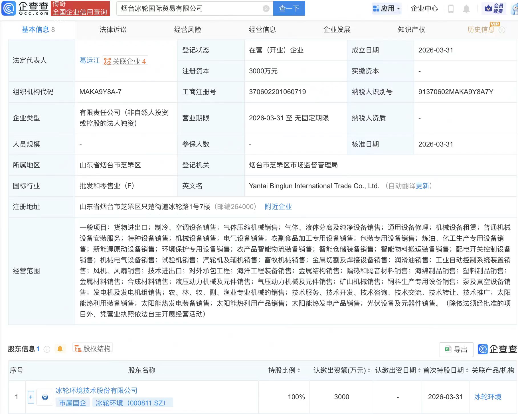 冰轮环境在烟台成立国际贸易公司