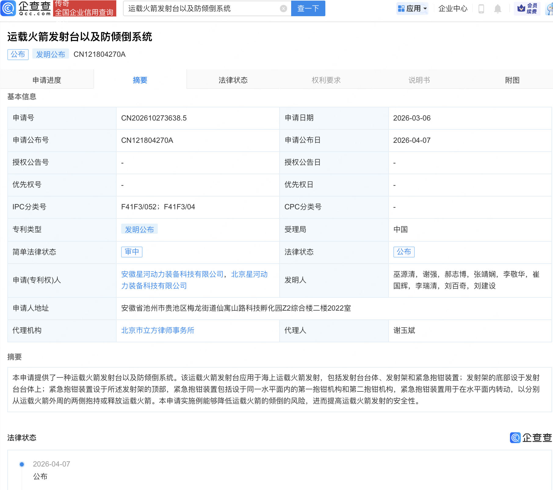 企查查APP显示,近日,安徽星河动力装备科技有限公司,北京星河动力装备科技有限公司“运载火箭发射台以及防倾倒系统”专利公布。企查查专利摘要显示,该运载火箭发射台应用于海上运载火箭发射,包括发射台台体、发射架和紧急抱钳装置;发射架的底部设于发射台台体上;紧急抱钳装置设于所述发射架的顶部,紧急抱钳装置包括设于同一水平面内的第一抱钳机构和第二抱钳机构,紧急抱钳装置用于在水平面内转动,以分别从运载火箭外周的两侧抱持或释放运载火箭。本申请实施例能够降低运载火箭的倾倒的风险,进而提高运载火箭发射的安全性。