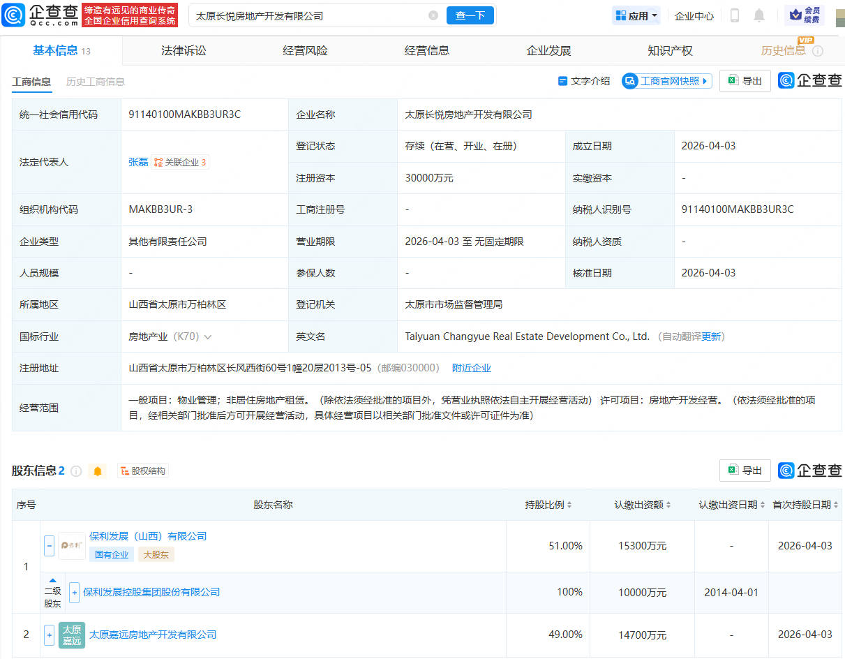 保利发展等在太原成立房地产开发公司,注册资本3亿元